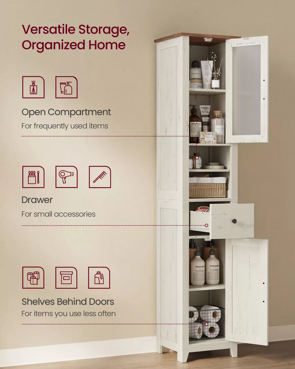 Ez a karcsú, magas fürdőszobaszekrény a modern farmhouse stílus és a praktikus tárolás tökéletes kombinációja. Két nyitott polcával, fiókjával és ajtók mögötti rekeszeivel maximálisan kihasználja a függőleges teret, miközben minimális helyet foglal.
