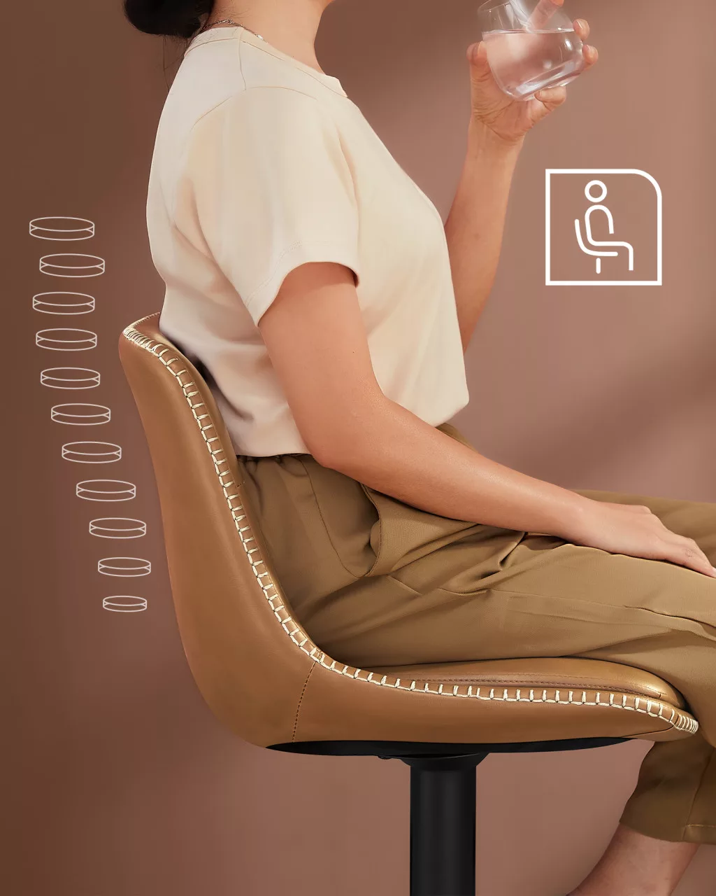 Elegáns és kényelmes bárszék szett steppelt karamell barna PU felülettel, amely tökéletesen illeszkedik bármilyen modern lakberendezésbe. A magasságállítható, 360°-ban forgó székek ergonomikus háttámlával és lábtartóval biztosítják a maximális kényelmet.