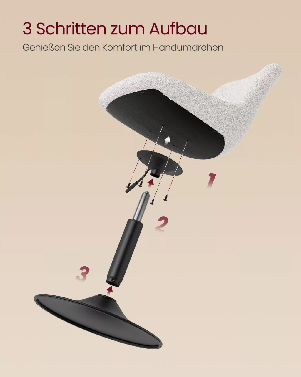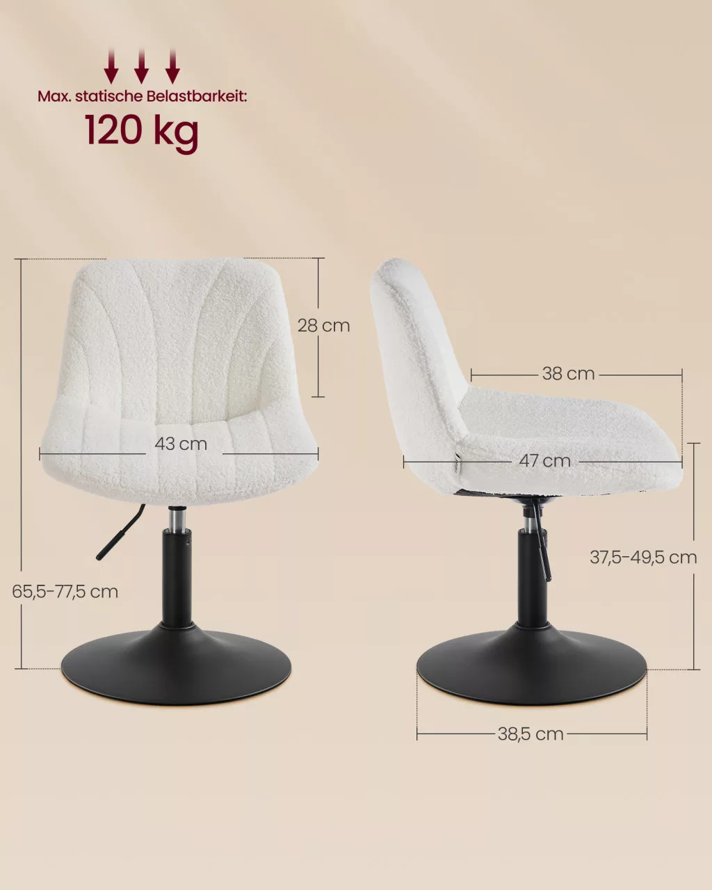 A szék 360°-ban szabadon forgatható és 37,5-49,5 cm között magasságban állítható, így könnyedén igazítható bármilyen fésülködőasztalhoz vagy pulthoz. A 38,5 cm átmérőjű, csúszásmentes talpgyűrűvel ellátott stabil talp megbízható stabilitást nyújt, miközben védi a padlót és csökkenti a zajt mozgatás közben. Az egyszerű összeszerelés és a kiváló minőség garantálja, hogy azonnal élvezhesse új kedvenc bútoralapját.