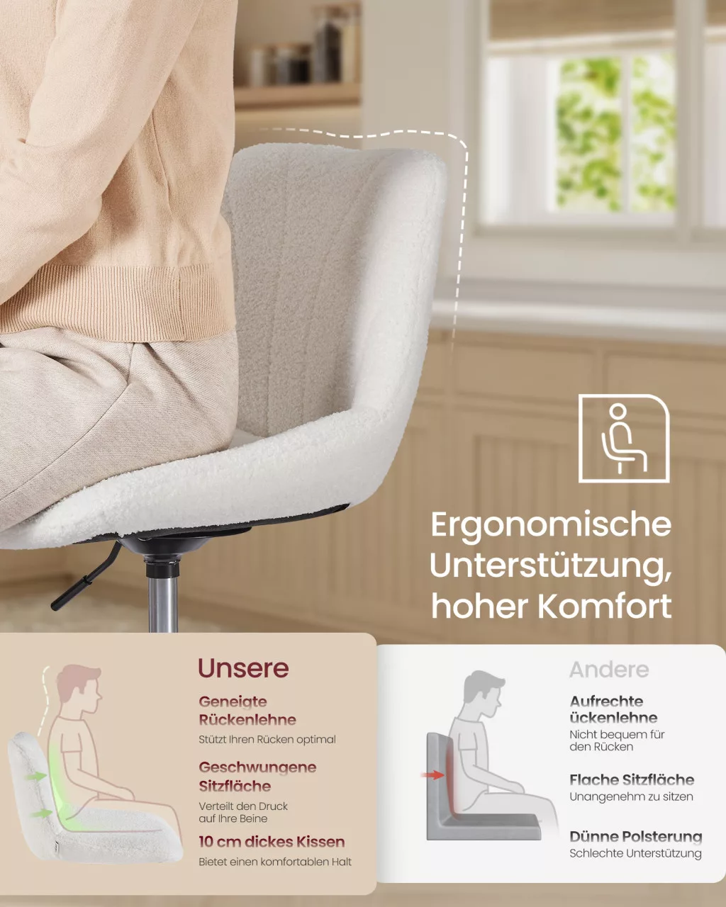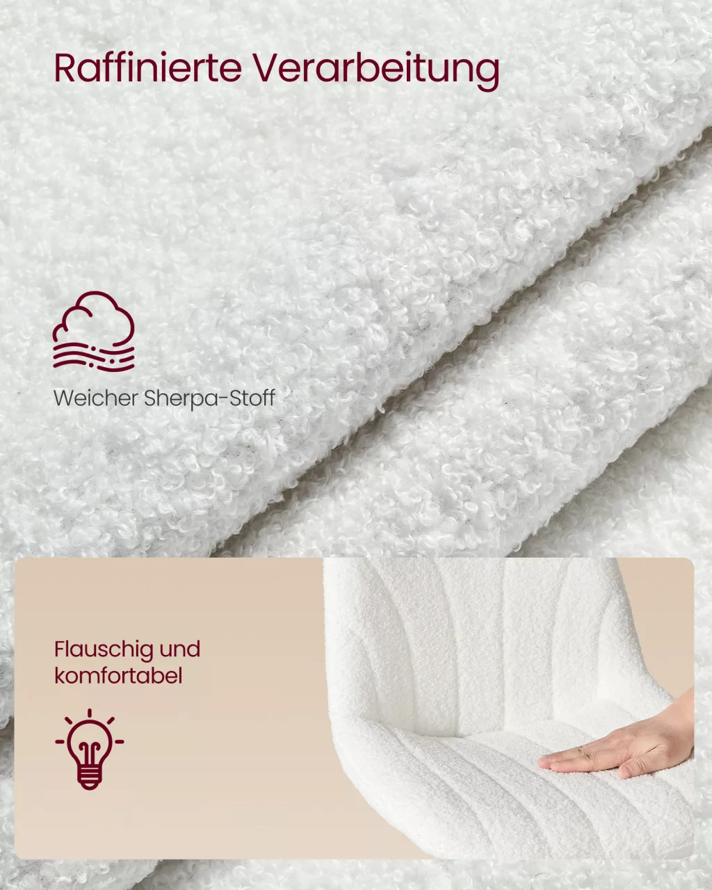 A VASAGLE fésülködő szék a modern elegancia és a praktikus funkcionalitás tökéletes ötvözete. A puha sherpa huzat kagylóhéj alakú steppelése egyedi megjelenést kölcsönöz, amely harmonikusan illeszkedik bármilyen berendezési stílushoz, legyen szó hálószobáról, öltözőről vagy étkező térről. Az ergonomikus kialakítás 28 cm magas támlával és 38 cm mély ülőfelülettel biztosítja az optimális támasztást és kényelmet hosszú használat során is.