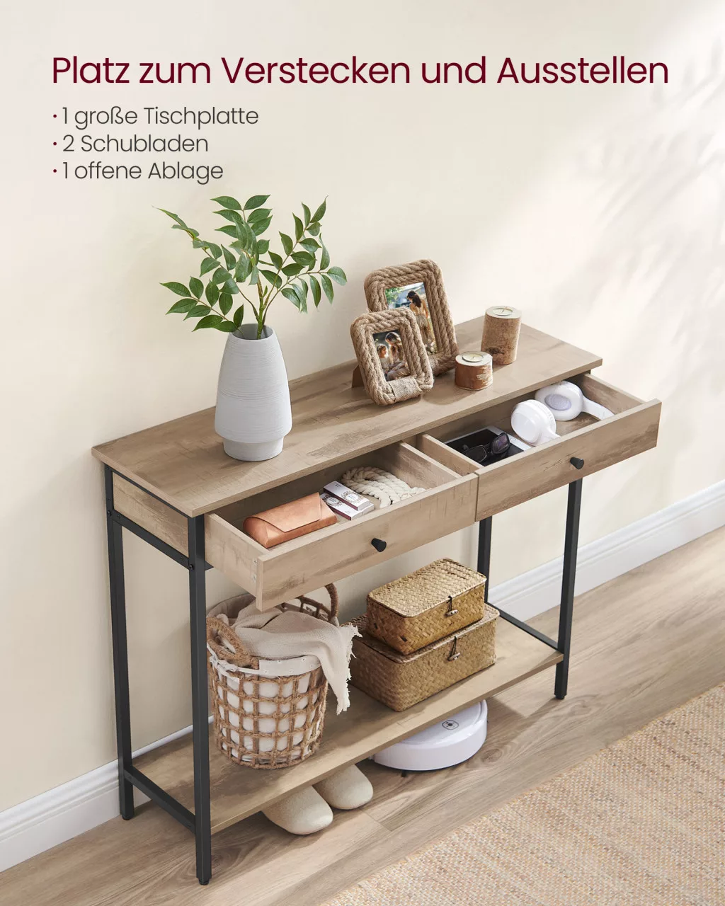 Stílusos és praktikus konzolasztal ipari designnal, amely rendet teremt otthonában. A 2 fiókos, acél vázas asztal tökéletes megoldás az előszobába vagy a nappali mellé.