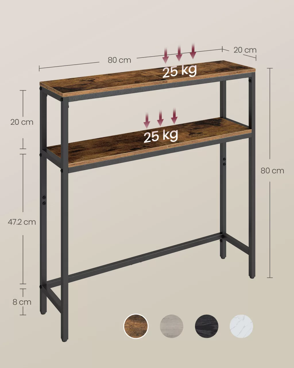 A VASAGLE konzolasztal tökéletes választás azok számára, akik modern, letisztult dizájnt és praktikus tárolási megoldást keresnek otthonukba. A karcsú fekete fémváz és a rusztikus barna színű forgácslapok harmonikus kontrasztja kortárs eleganciát kölcsönöz bármely helyiségnek. A 20 x 80 x 80 cm-es méretének köszönhetően ideális szűkös terekbe, mint az előszoba vagy a nappali, ahol minden centiméter számít.