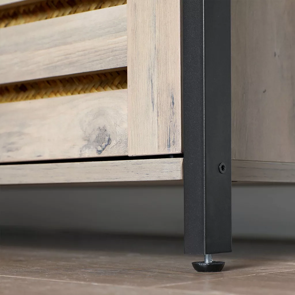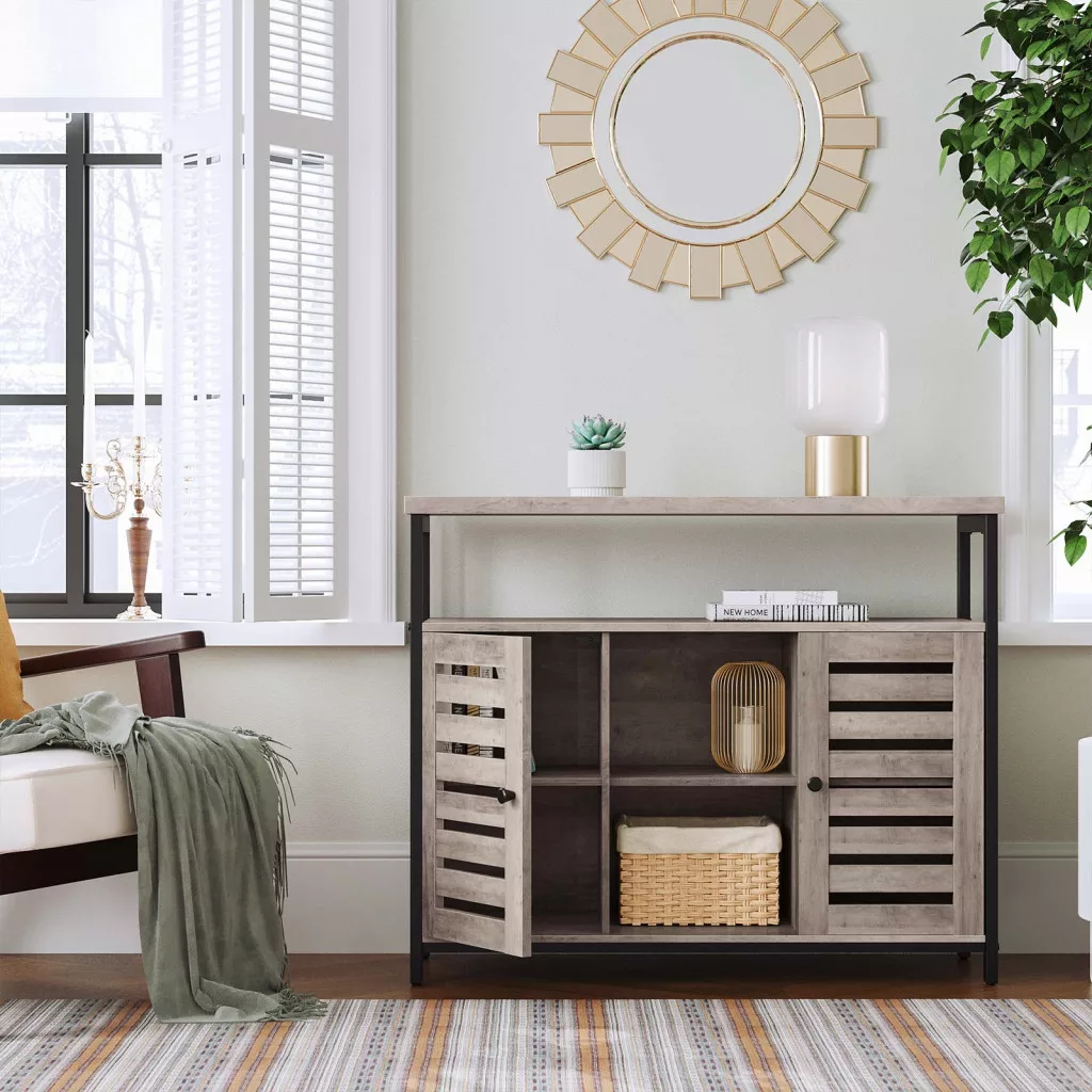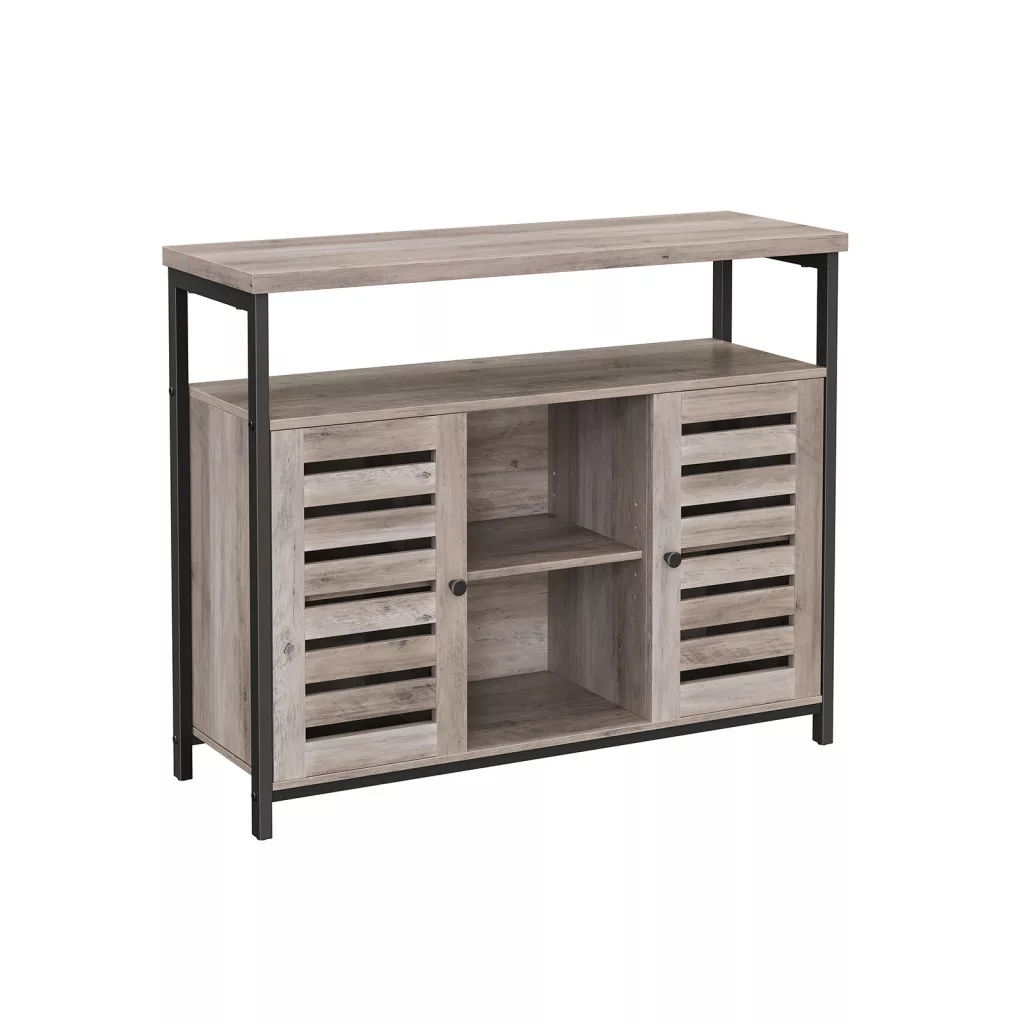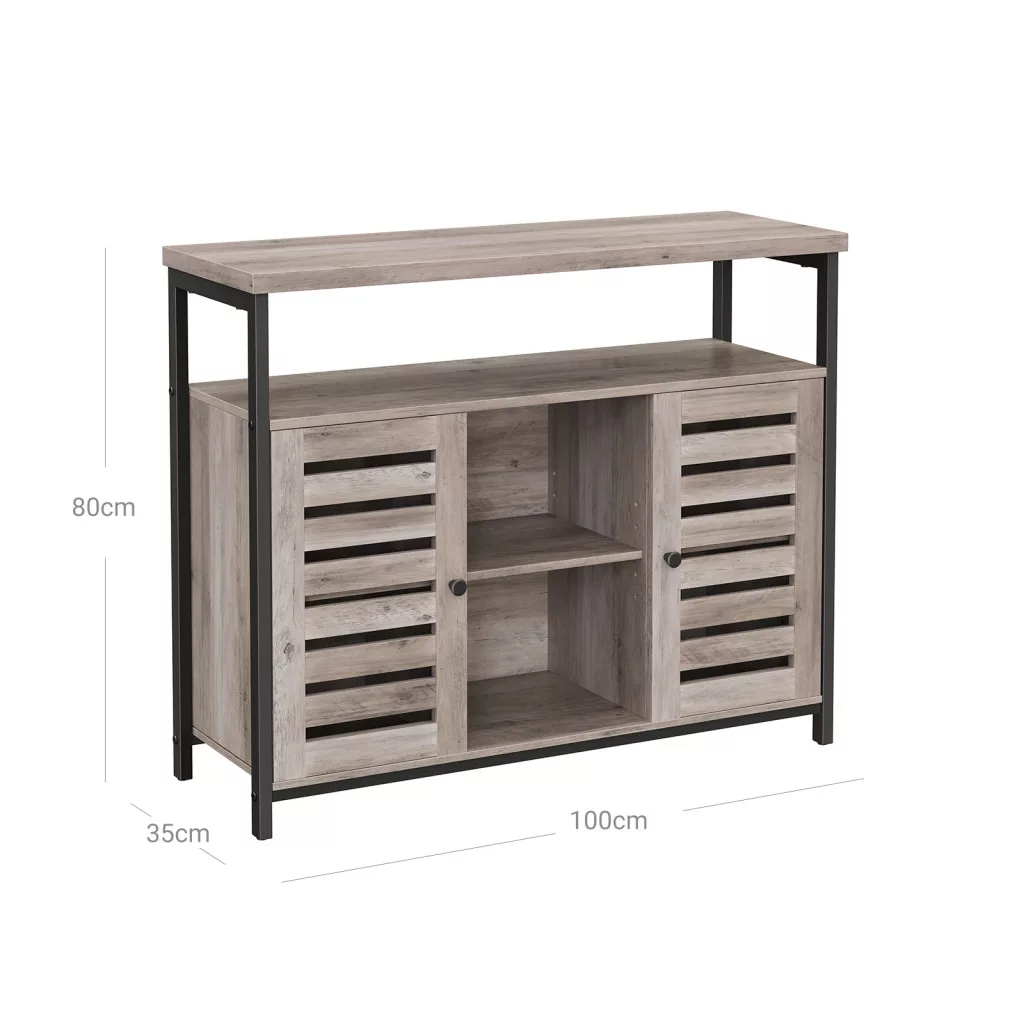 Modern ipari stílusú tárolószekrény zsalus ajtókkal, amely tökéletes megoldást nyújt a rendezett tároláshoz az otthon bármely helyiségében.