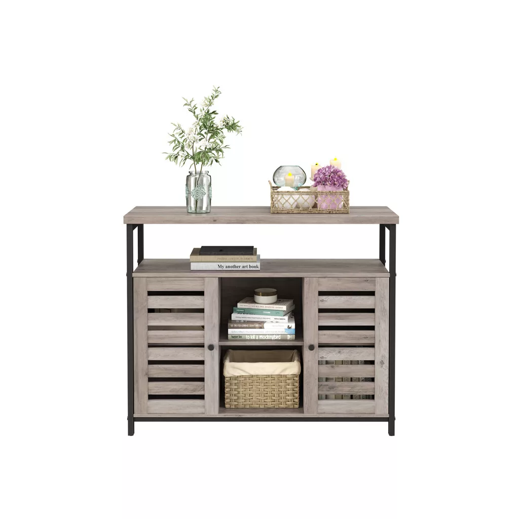Ez az ipari stílusú tárolószekrény ötvözi a funkcionalitást és az esztétikumot. A szürke-bézs színű korpusz és a fekete fémváz harmonikus kombinációja modern megjelenést kölcsönöz, míg a zsalus ajtók egyedi karaktert adnak a bútornak. A tágas felső polc, a két zsalus ajtó mögötti állítható polcok és a középső nyitott rekeszek maximális tárolási rugalmasságot biztosítanak.