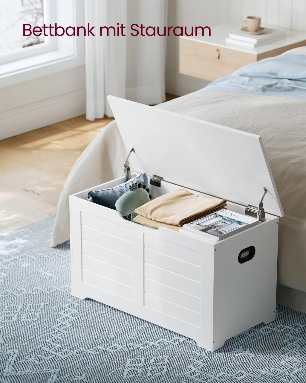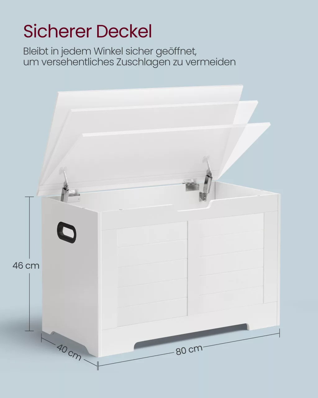 Stílusos és praktikus tároló pad, amely egyszerre szolgál kényelmes ülőhelyként és tágas tárolóként. A dupla biztonsági zsanérok biztonságos használatot garantálnak, míg a modern fehér dizájn bármely helyiségbe illeszkedik.