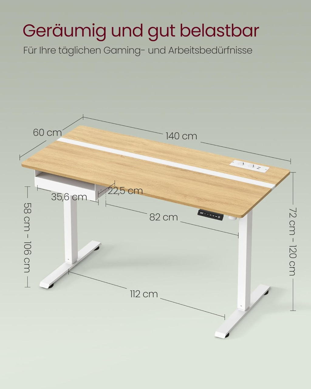 A beépített elektromos csatlakozók és USB portok praktikus töltési lehetőséget biztosítanak, míg a fiók és az oldalsó akasztó segít rendszerezni a munkaterületet. Az asztal stabil szerkezetének és a görgőknek köszönhetően könnyen mozgatható, mégis biztonságos munkafelületet biztosít.