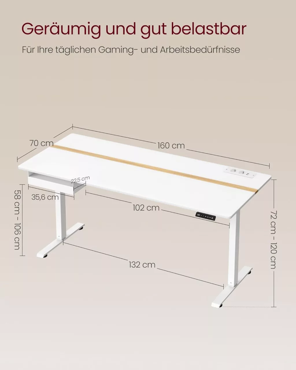VASAGLE LSD116W01 Elektromos Állítható Magasságú Íróasztal Beépített Aljzattal Felhőfehér/Arany Tölgy