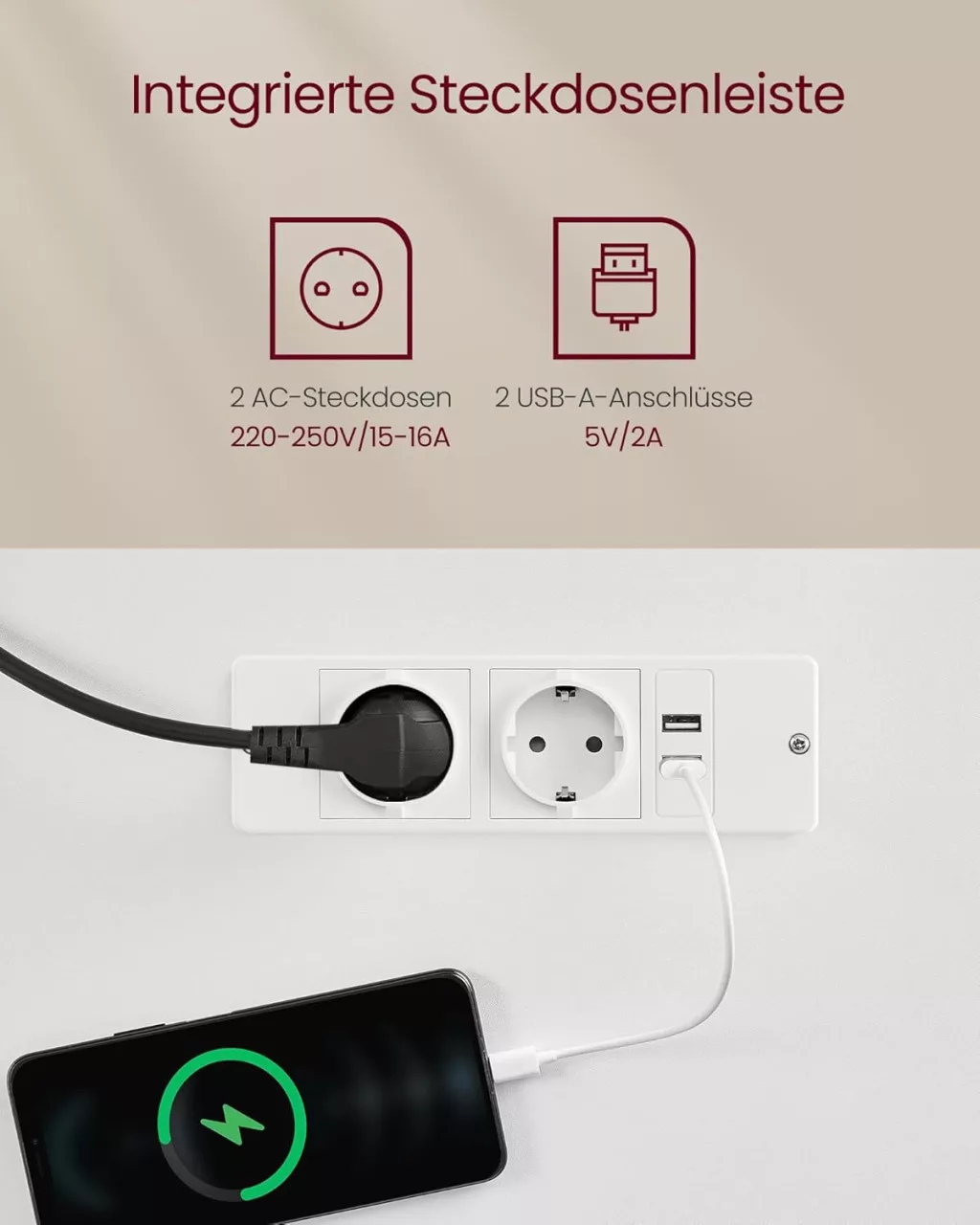 • Beépített áramellátás: 2 konnektor és 2 USB port az eszközök kényelmes töltéséhez