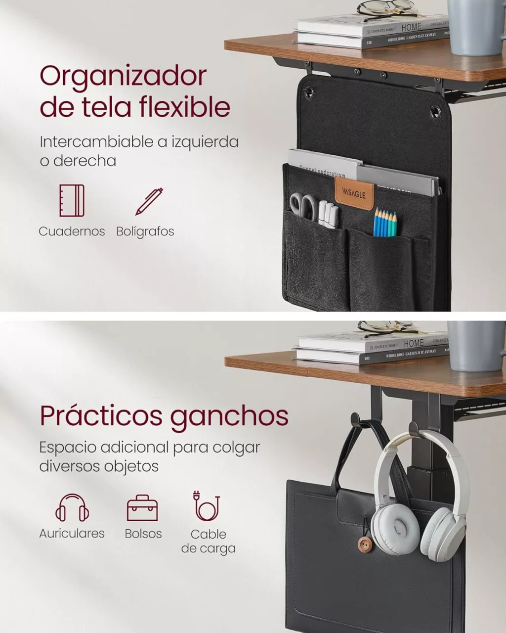 Az asztal praktikus kiegészítőkkel van felszerelve, mint az Oxford szövet rendszerező, dupla akasztó és USB töltőport. A kettős támasztórudak és az állítható lábak maximális stabilitást biztosítanak, míg a beépített ütközésvédelem garantálja a biztonságos használatot.