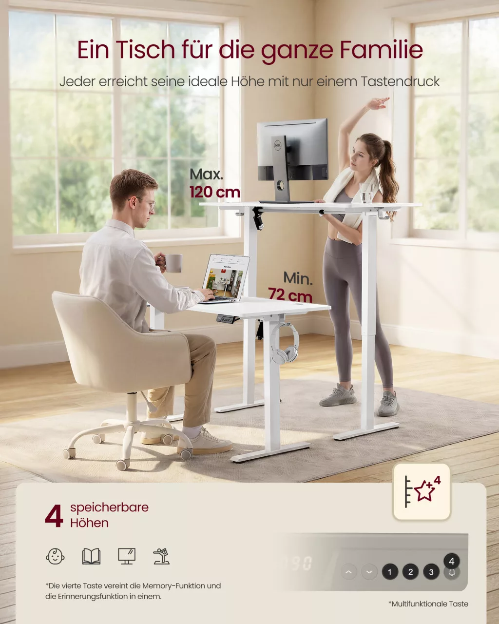 Elektromosan állítható magasságú íróasztal 72-120 cm között, 4 memóriahellyel és ülésidő-emlékeztetővel az egészséges munkavégzésért. Stabil acélváz, 70 kg teherbírás és praktikus kábelrendező megoldások.