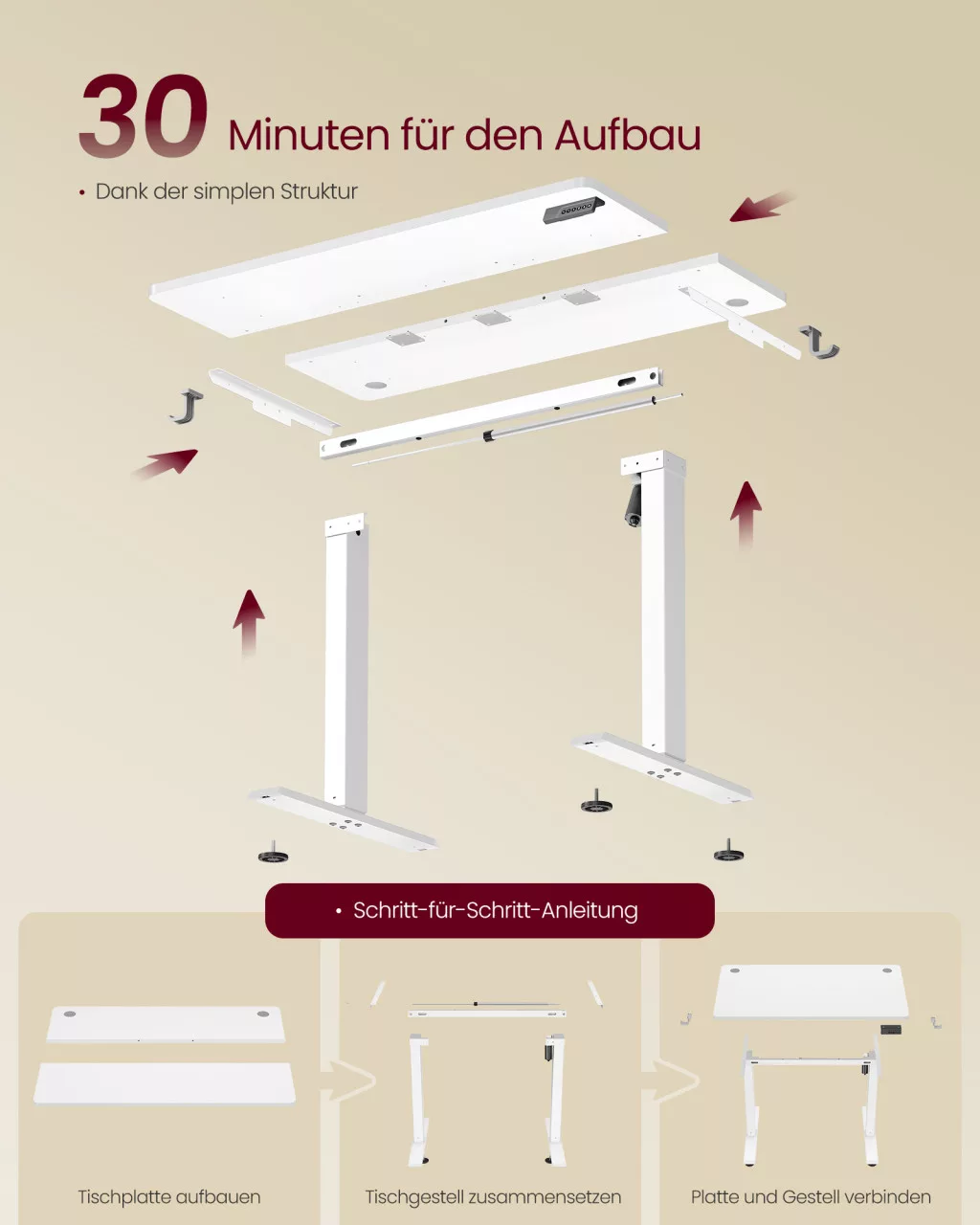 A megerősített acélváz és a 20 000 emelési ciklusra tesztelt motor garantálja a stabilitást és hosszú élettartamot, akár 70 kg terhelés mellett is. A 2 kábelvezető nyílás és a praktikus akasztók rendben tartják munkaterületét, míg a lekerekített sarkok és a biztonsági zárfunkció védik Önt és családját. A felhőfehér asztallappal és modern dizájnnal ez az asztal nemcsak funkcionális, hanem stílusos kiegészítője is otthoni irodájának.
