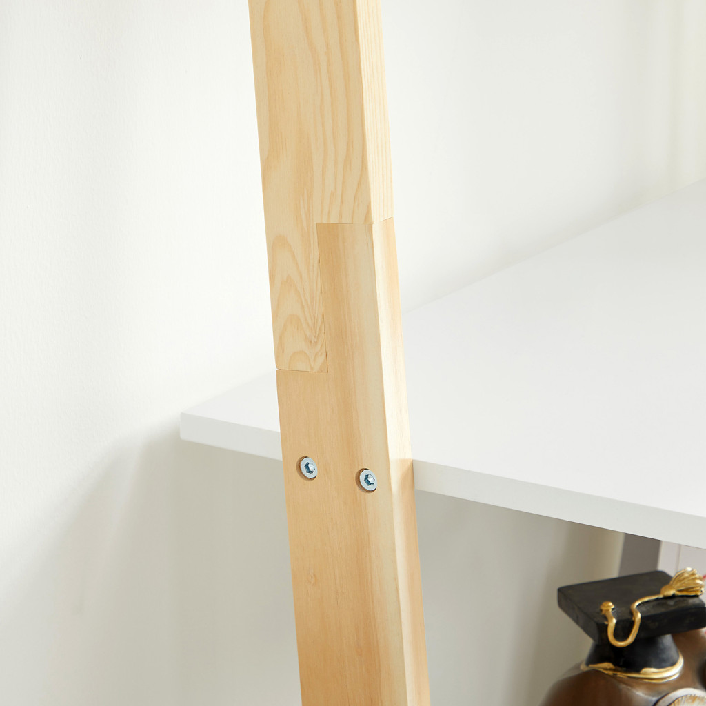 Elegáns, skandináv stílusú létrapolc természetes fenyő kerettel és matt fehér polcokkal, amely tökéletes megoldást nyújt a tárolásra és dekorációra egyaránt.