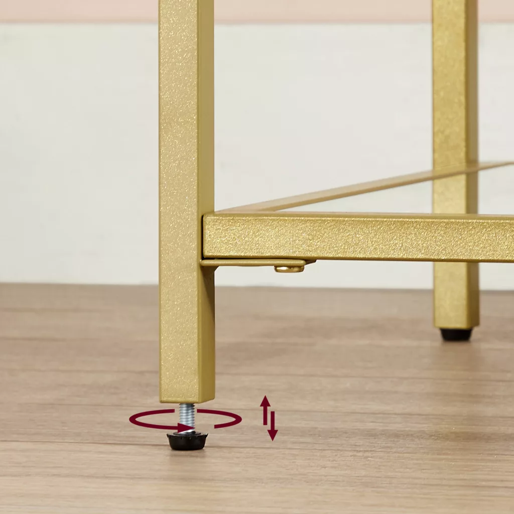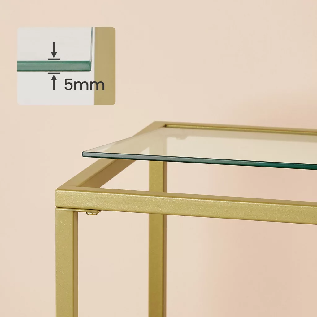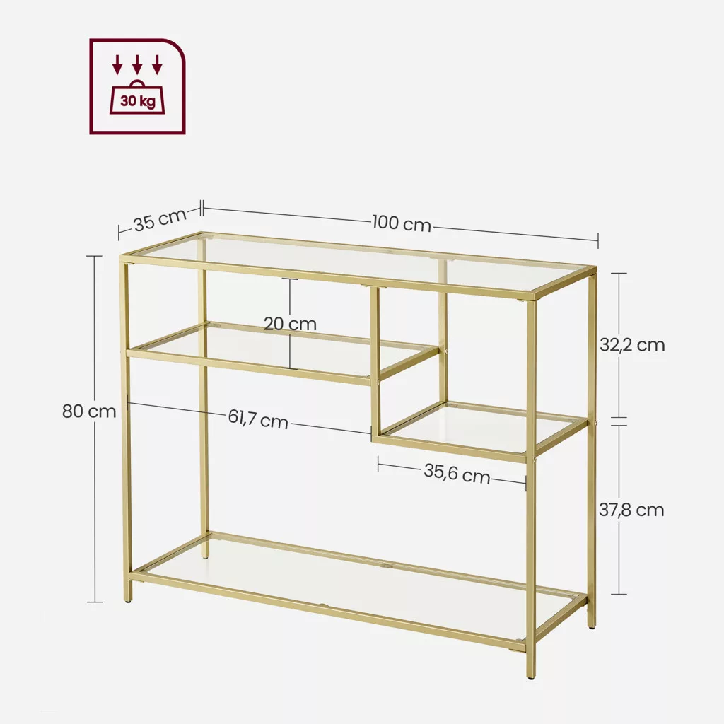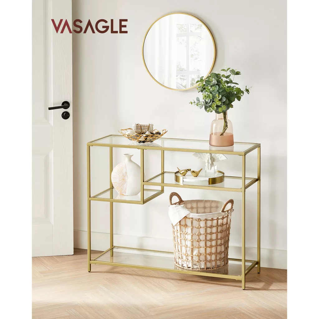 Ez a VASAGLE konzolasztal az elegancia és praktikum tökéletes ötvözete. Az arany színű acélváz és az edzett üveg polcok modern luxust sugároznak, míg az aszimmetrikus polckialakítás egyedi karaktert kölcsönöz a bútornak. A 5 mm vastag edzett üveg polcok biztonságos tárolófelületet nyújtanak dekorációs tárgyak, könyvek vagy mindennapi használati eszközök számára.