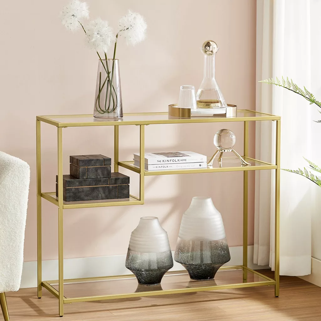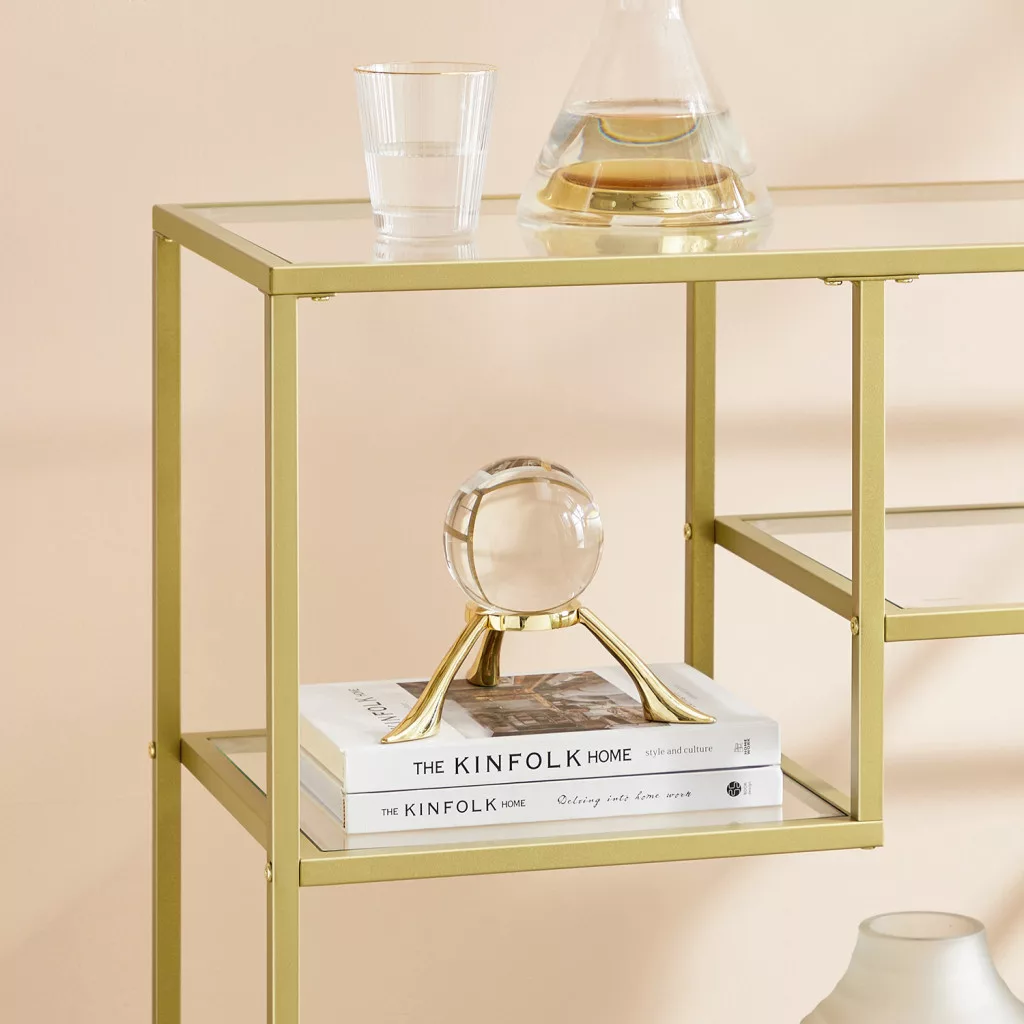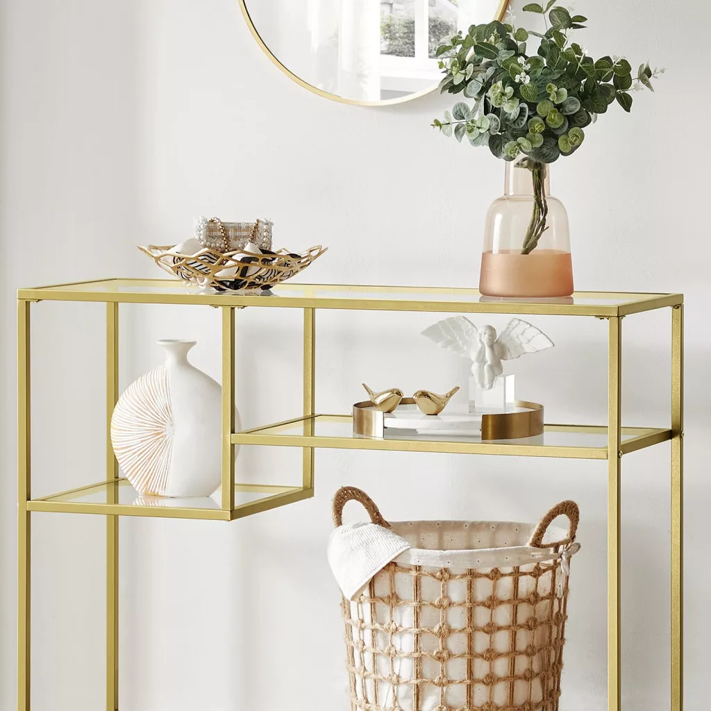 VASAGLE Luxury Arany Üveg Konzolasztal Aszimmetrikus Polcokkal