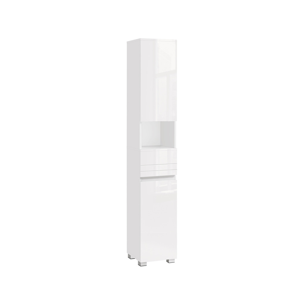 Ez a karcsú fürdőszobai szekrény tökéletes megoldást nyújt a helytakarékos tárolásra. A 170 cm magas egység felső és alsó szekrényrésszel, nyitott polcokkal és fiókkal rendelkezik, amelyek rugalmas tárolási lehetőséget biztosítanak különböző méretű tárgyak számára.
