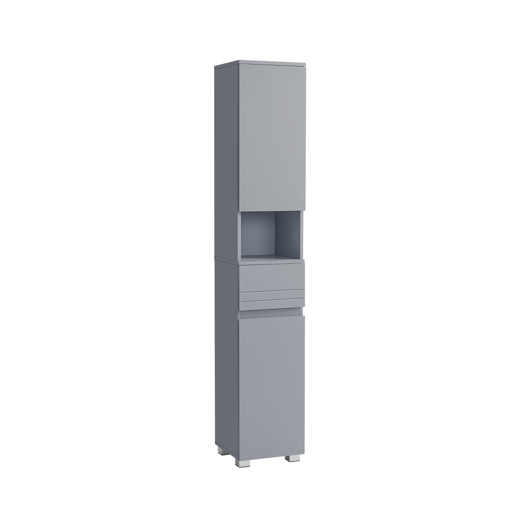 Sokoldalú, 170 cm magas fürdőszobai szekrény állítható polcokkal, fiókkal és nyitott tárolórésszel, amely maximális helykihasználást biztosít a fürdőszobában.