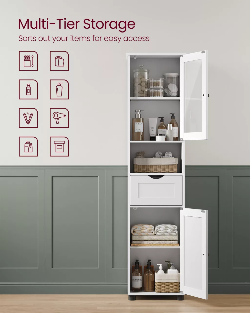 Ez a karcsú, magas fürdőszobai szekrény tökéletes tárolási megoldást kínál kis helyiségekhez. Az üvegajtós rekeszek, nyitott polcok és fiók kombinációja elegáns és praktikus rendszert biztosít fürdőszobai kellékeid számára.