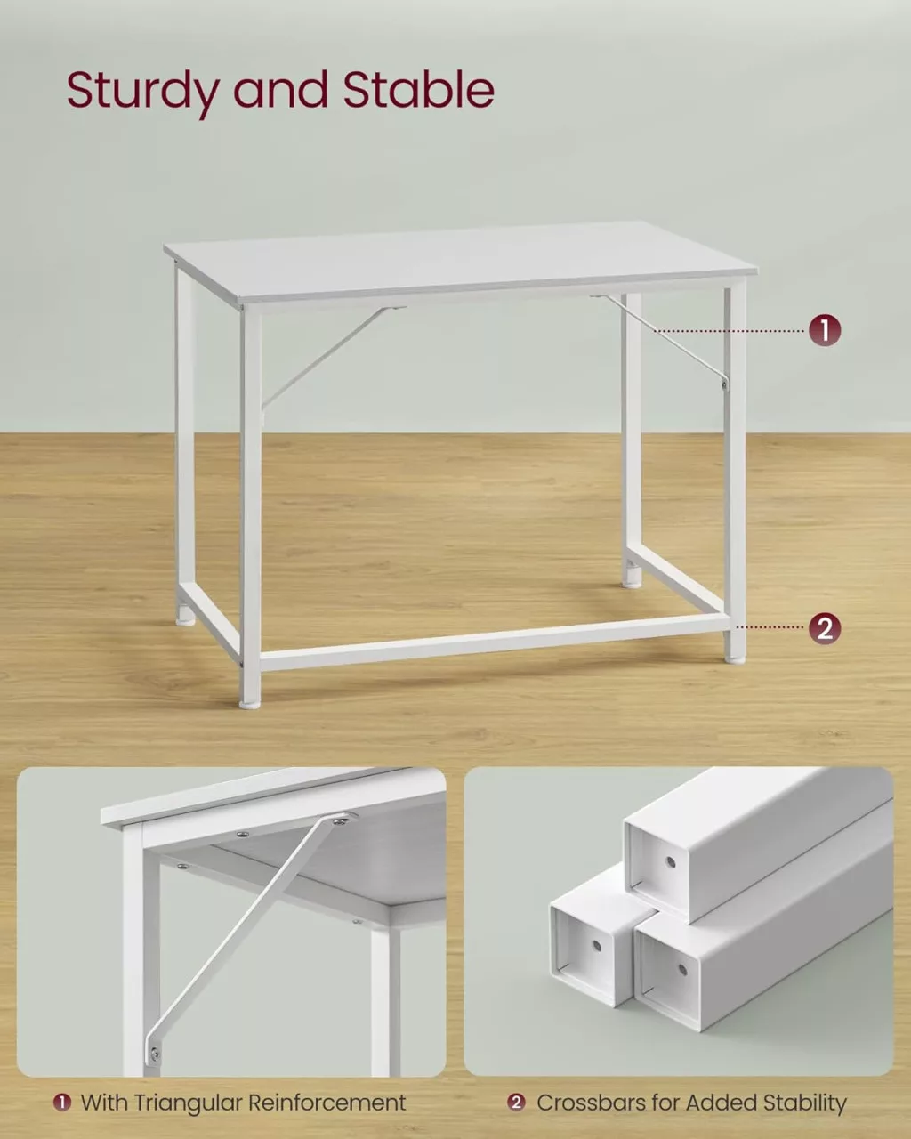 A prémium acélváz és a megerősített asztallap stabil, billegésmentes munkakörnyezetet teremt. Az állítható lábaknak köszönhetően egyenetlen padlón is tökéletesen áll, míg letisztult fehér színvilága harmonikusan illeszkedik bármilyen lakberendezési stílushoz.