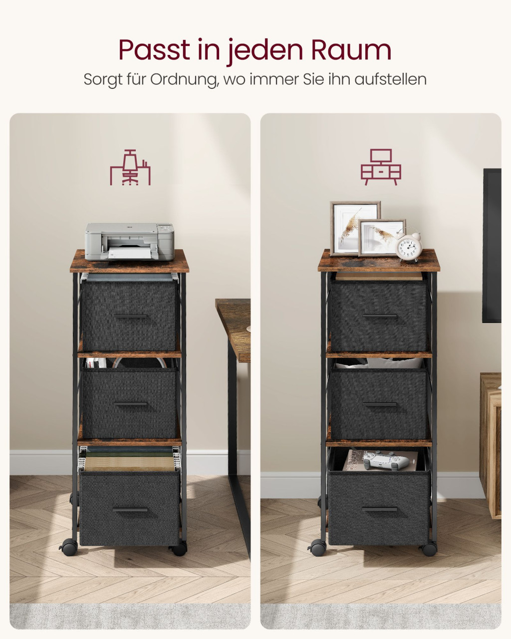 Sokoldalú irattartó szekrény 3 textil fiókkal, görgőkkel és fékezővel, ideális A4-es dokumentumok tárolására és nyomtató állványként való használatra.