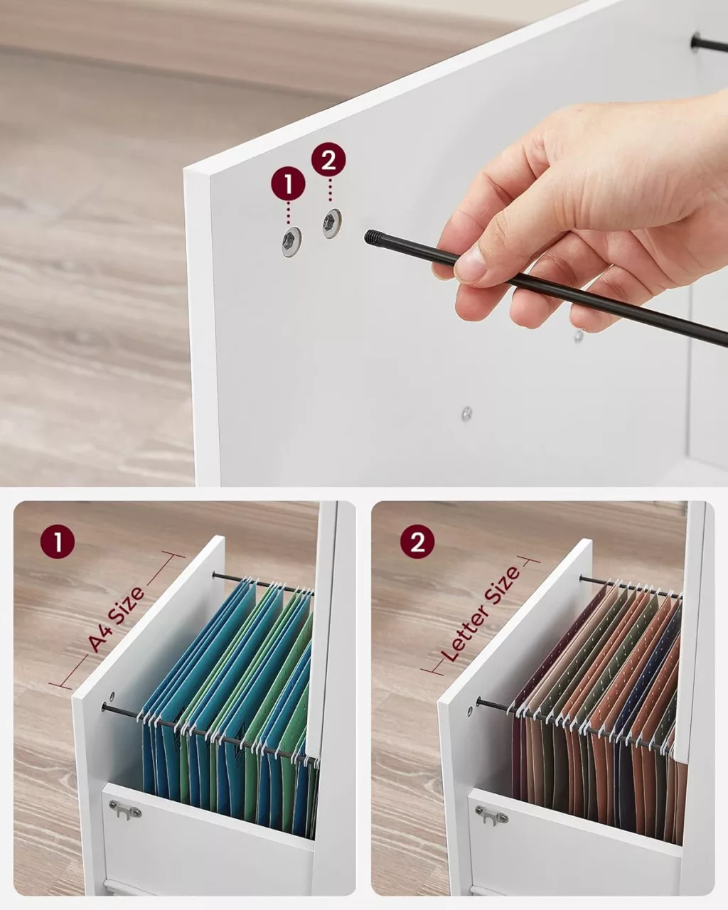 • Tárolókapacitás: Két tágas fiók függőmappatartó sínekkel