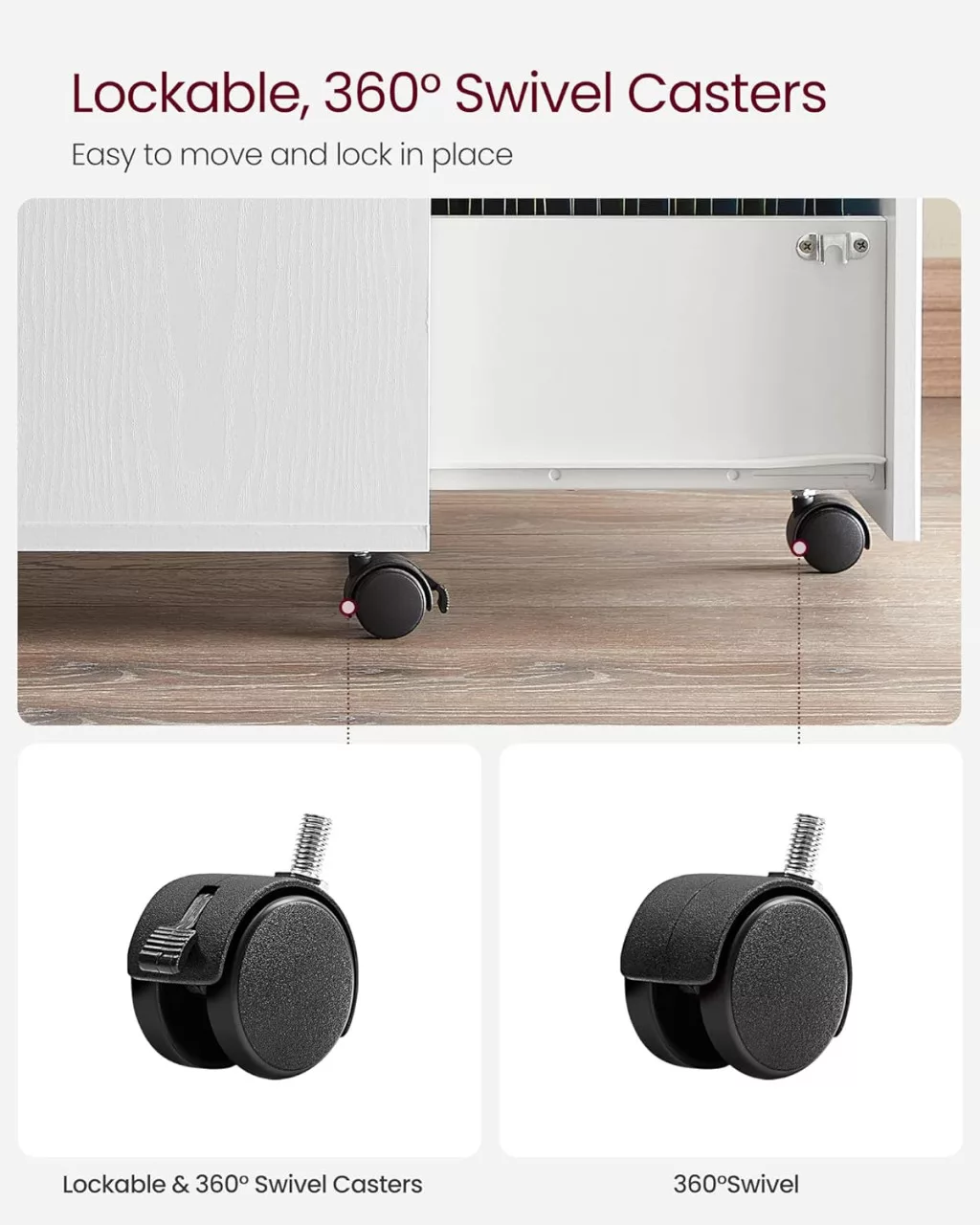A kompakt kialakítás és az öt 360°-ban elforduló kerék lehetővé teszi a szekrény könnyű mozgatását, miközben a két első kerék rögzítőfékje stabilitást biztosít. A felső lap ideális nyomtatók vagy egyéb irodai eszközök elhelyezésére, maximálisan 50 kg teherbírással.