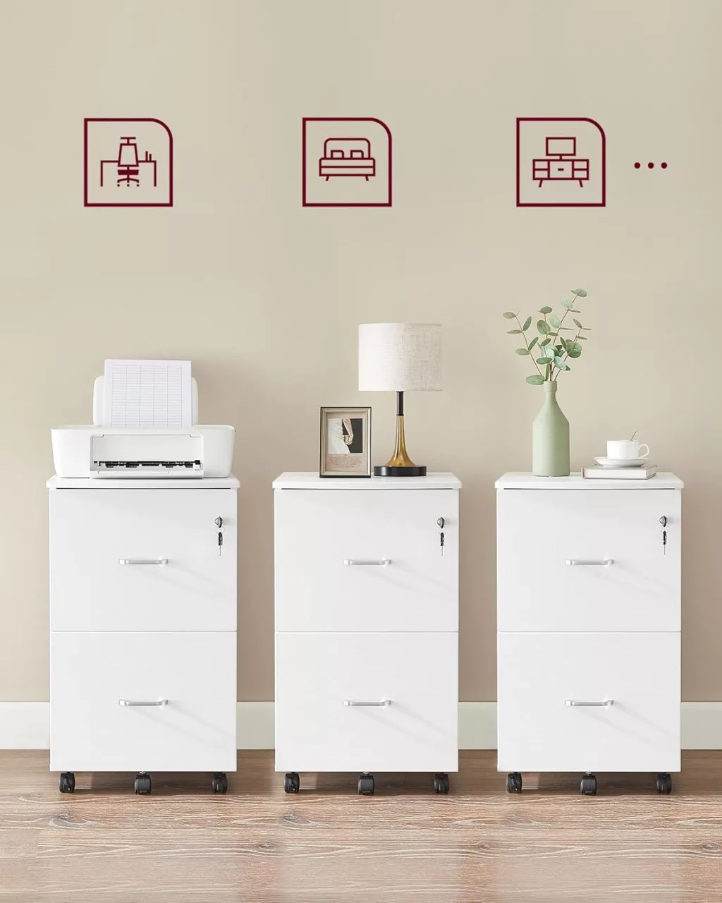 Kompakt és sokoldalú irodai irattartó szekrény két zárható fiókkal, görgőkkel és nyomtatóállvány funkcióval, ideális otthoni irodákba.