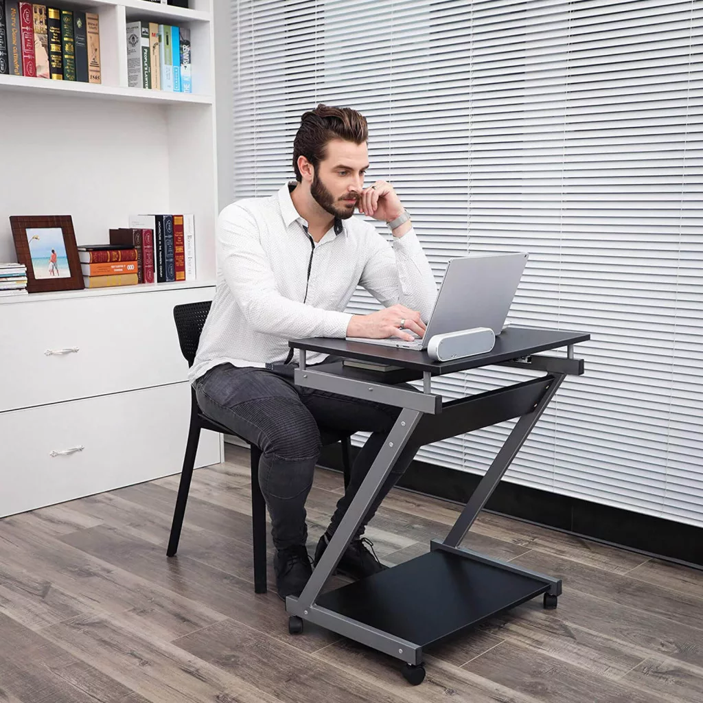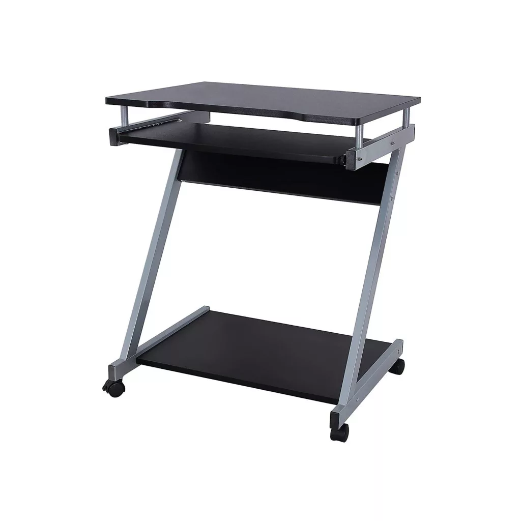 Kompakt, mobil számítógépasztal kihúzható billentyűzettartóval és görgőkkel, ideális kis terekbe. Modern Z-alakú dizájn és stabil acélszerkezet jellemzi.