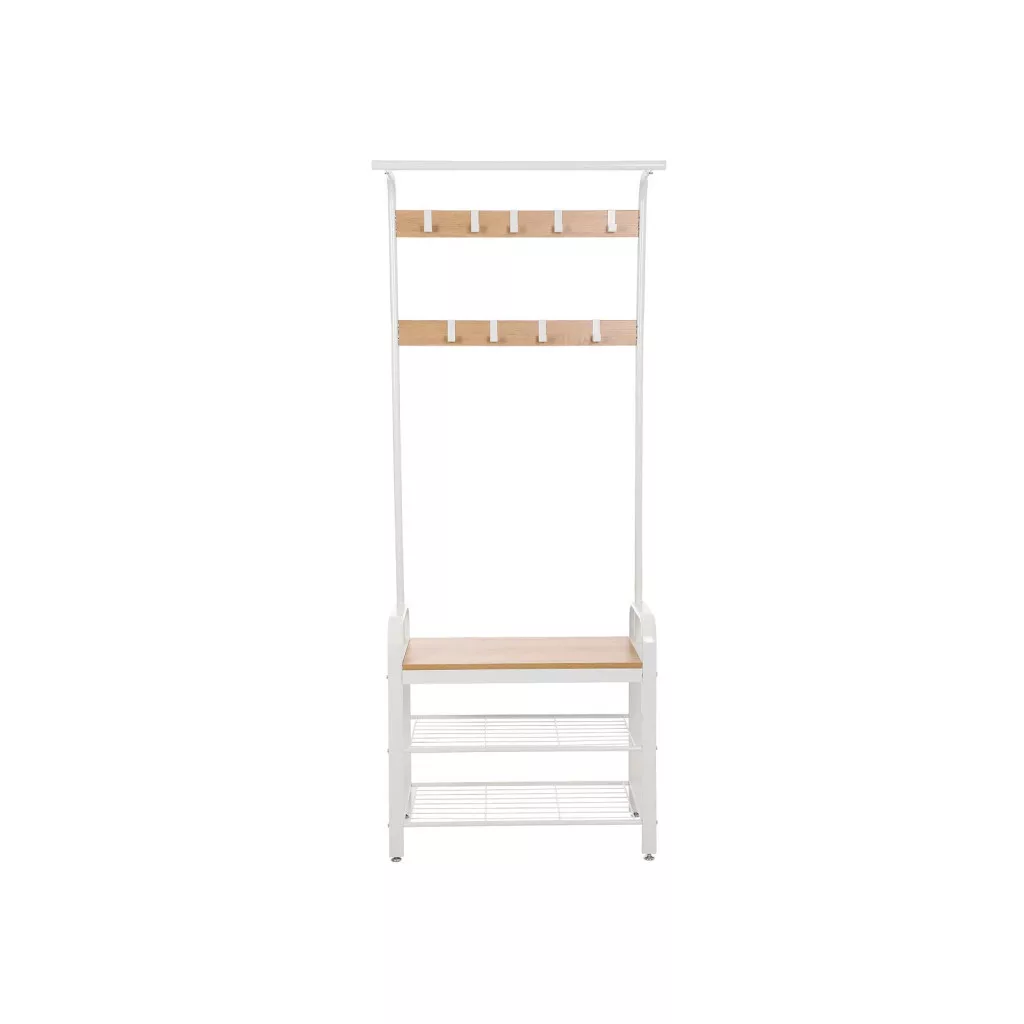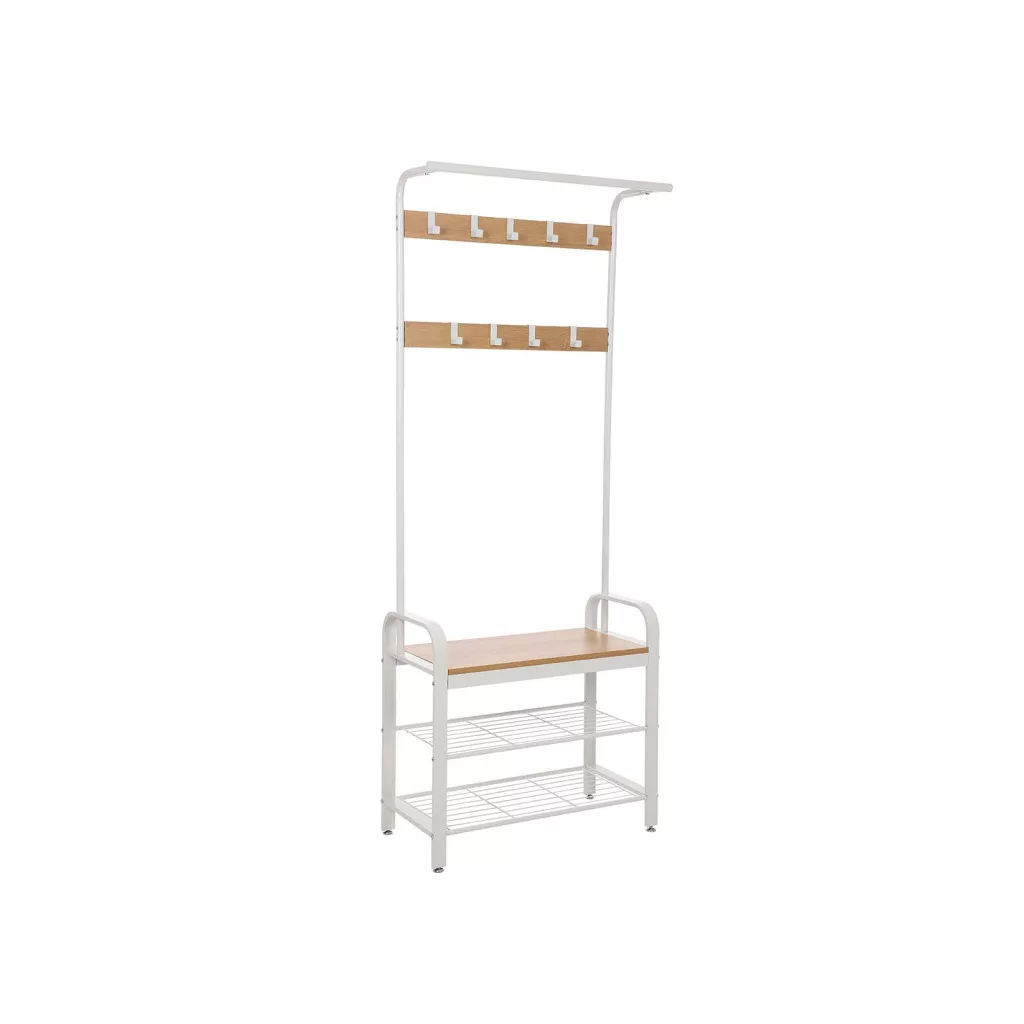 Multifunkciós előszobai állvány 9 levehető akasztóval, ruhaállvánnyal és cipőtárolós paddal, amely tökéletes megoldást nyújt az előszoba rendszerezésére.