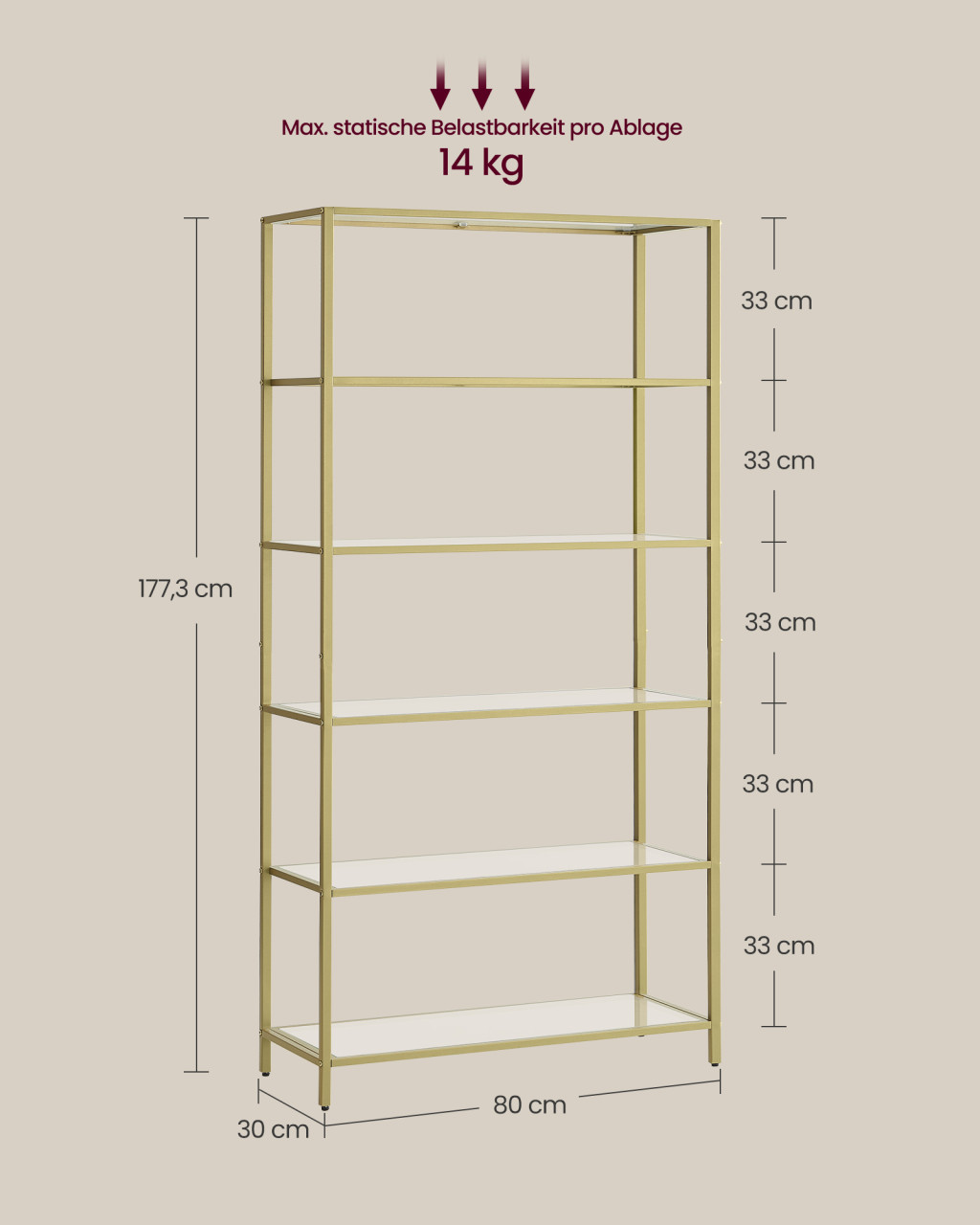 Ez a modern, minimál stílusú polcrendszer átlátszó üvegpolcaival és arany színű vázával azonnal a helyiség központi elemévé válik. A karcsú kialakítás ellenére rendkívül stabil szerkezet 6 szinten biztosít helyet könyveknek, dekorációs tárgyaknak vagy akár fürdőszobai kellékeknek.