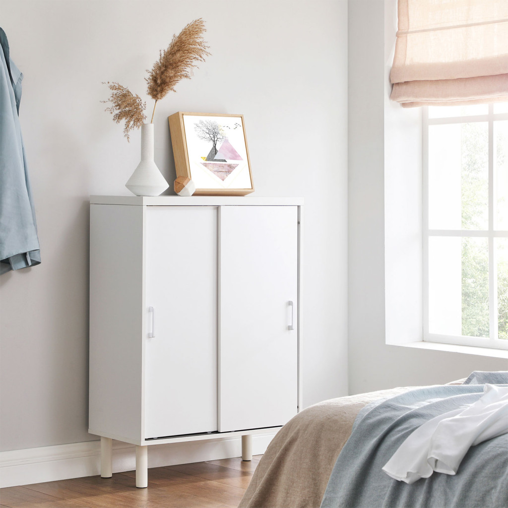 A modern, minimalista dizájn és a fehér szín harmonikusan illeszkedik bármilyen lakberendezési stílushoz. A fém lábak stabil tartást biztosítanak, a bútor pedig könnyen tisztítható és karbantartható.