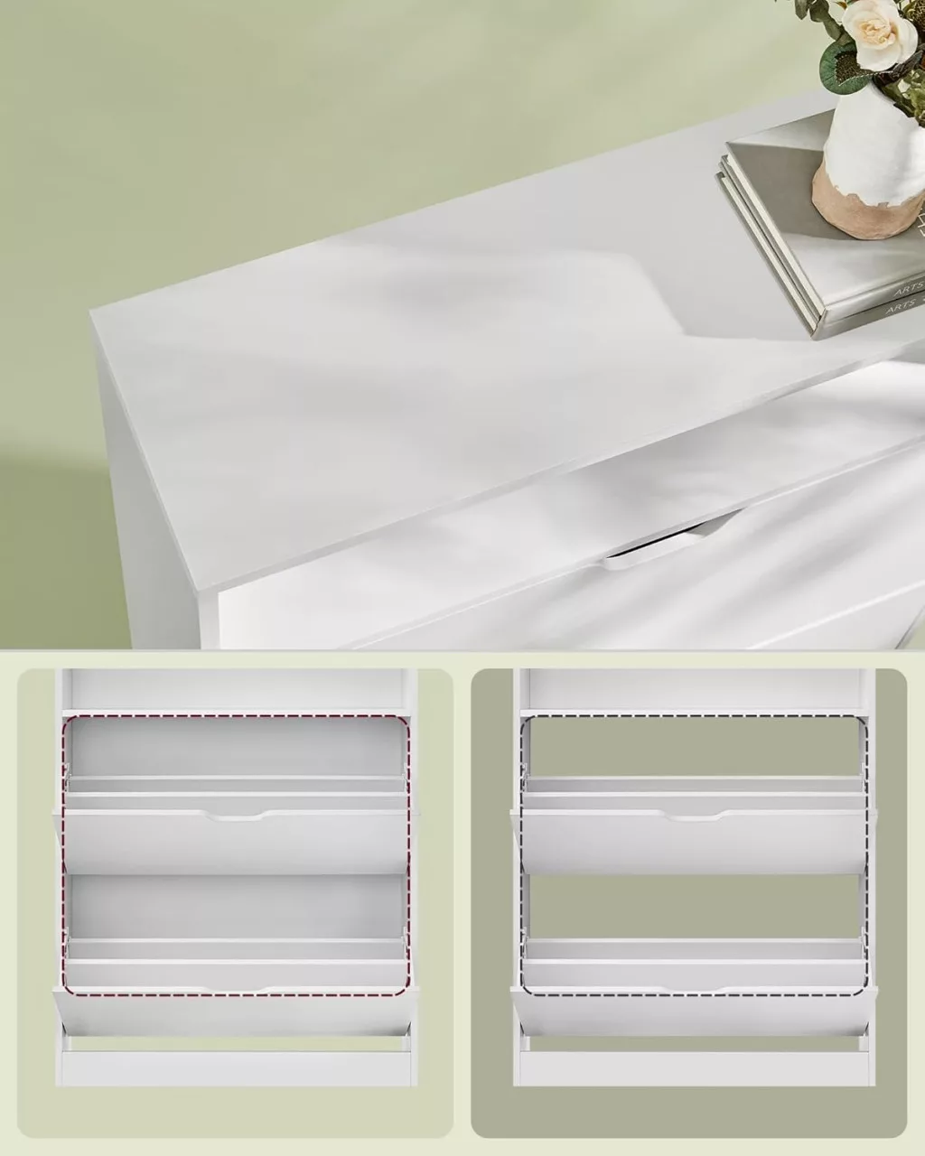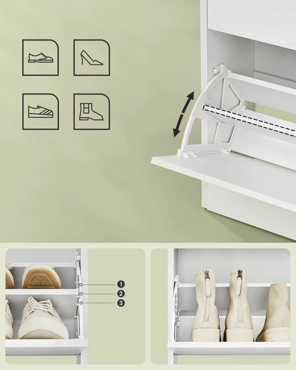 Az állítható belső rekeszeknek köszönhetően különböző méretű cipők tárolására alkalmas, míg a hátsó fal védelmet nyújt a por ellen. A minimalista design és a magas minőségű anyagok használata hosszú élettartamot garantál.