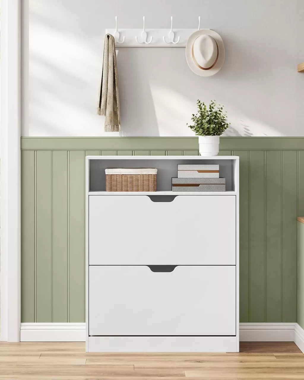 Ez a modern vonalvezetésű cipősszekrény tökéletesen ötvözi a funkcionalitást és az esztétikumot. A felhőfehér színű bútor két lehajtható ajtóval és egy nyitott polcrésszel rendelkezik, amely ideális dekorációs tárgyak vagy mindennapi használati eszközök tárolására.