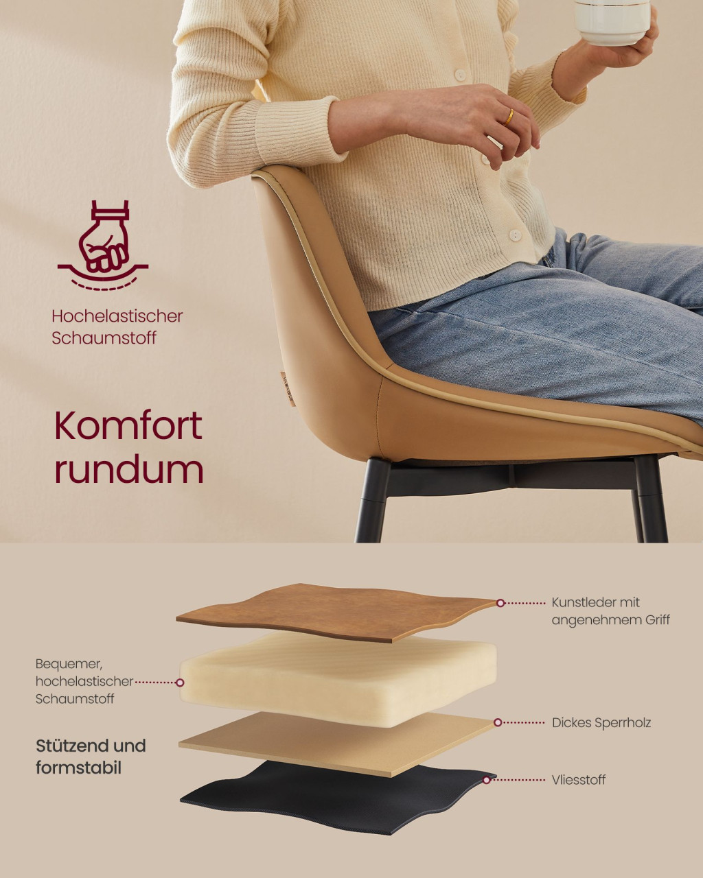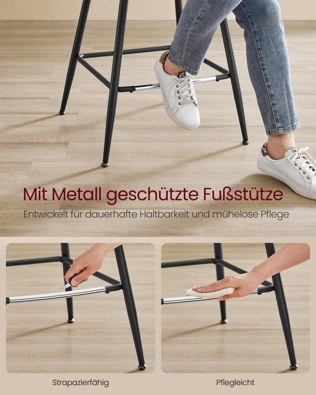 A VASAGLE bárszék kollekció ötvözi az ergonomikus kialakítást a modern dizájnnal. A karamell színű műbőr kárpitozás és a fekete fém lábak elegáns kontrasztot alkotnak, míg az egybeöntött ülőfelület és háttámla maximális kényelmet biztosít hosszabb használat során is.