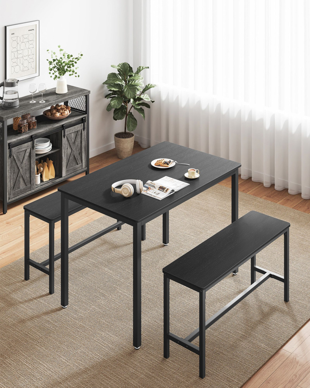 Ez a modern VASAGLE étkezőgarnitúra tökéletes megoldást kínál a kisebb lakóterek számára. Az elegáns fekete kivitelű szett egy 110 cm széles asztalt és két kényelmes padot tartalmaz, amelyek használaton kívül az asztal alá tolhatók a helytakarékosság jegyében.