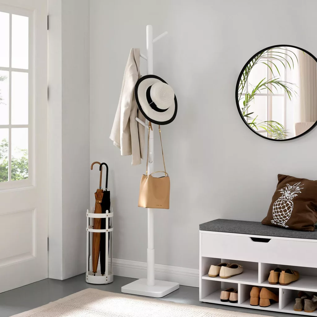 Elegáns, fehér színű álló ruhafogas 8 lekerekített akasztóval, amely tökéletes megoldást nyújt kabátok, táskák és kiegészítők rendezett tárolására az előszobában vagy hálószobában.