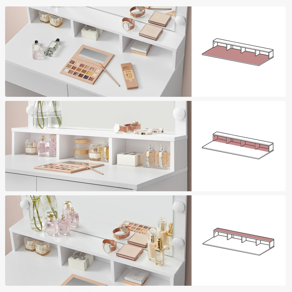 Ez a modern vonalvezetésű fésülködőasztal tökéletes kombinációja a funkcionalitásnak és a stílusnak. A 9 állítható fényerejű LED izzó optimális megvilágítást biztosít a sminkeléshez, míg a nagy tükör teljes rálátást nyújt.