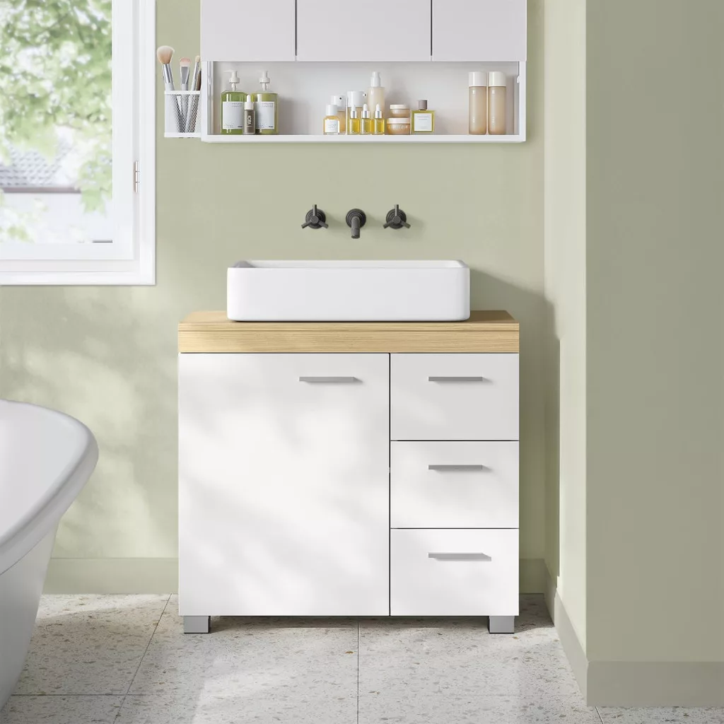 Praktikus fürdőszobai szekrény bőséges tárolóhellyel, 3 fiókkal és állítható polccal, modern felhőfehér és natúr színkombinációban.