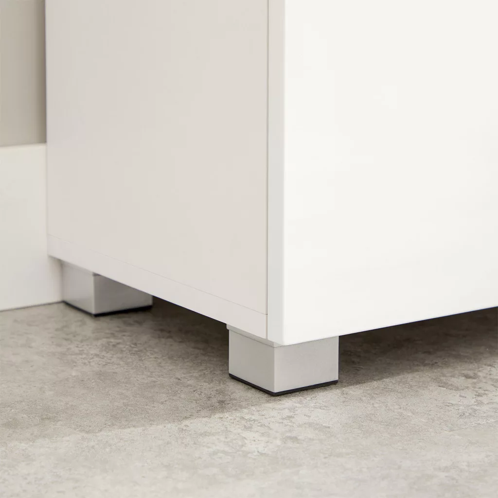 Ez a modern vonalvezetésű fürdőszobai szekrény tökéletes egyensúlyt teremt a funkcionalitás és az esztétika között. A fényes fehér ajtók és a matt fehér korpusz elegáns megjelenést kölcsönöz, míg az állítható polc és a fiók maximális rugalmasságot biztosít a tárolásban.
