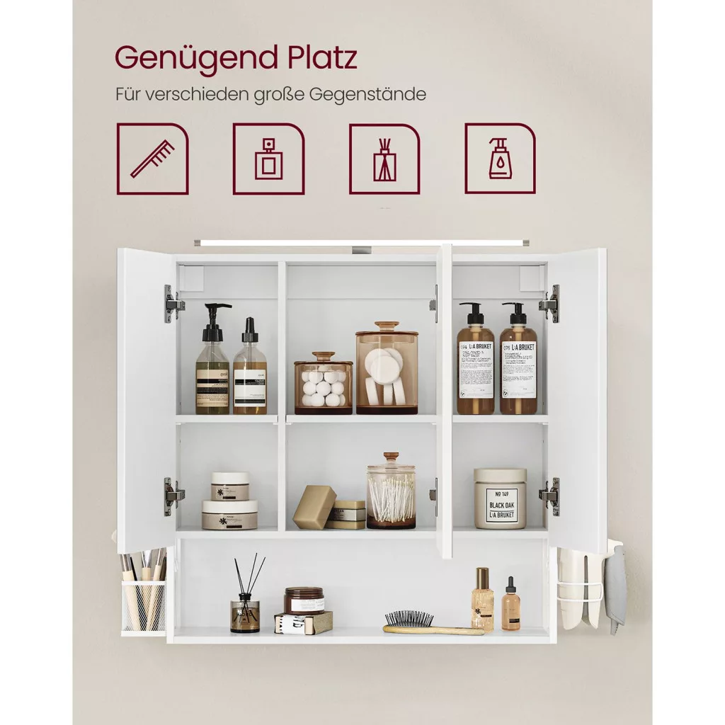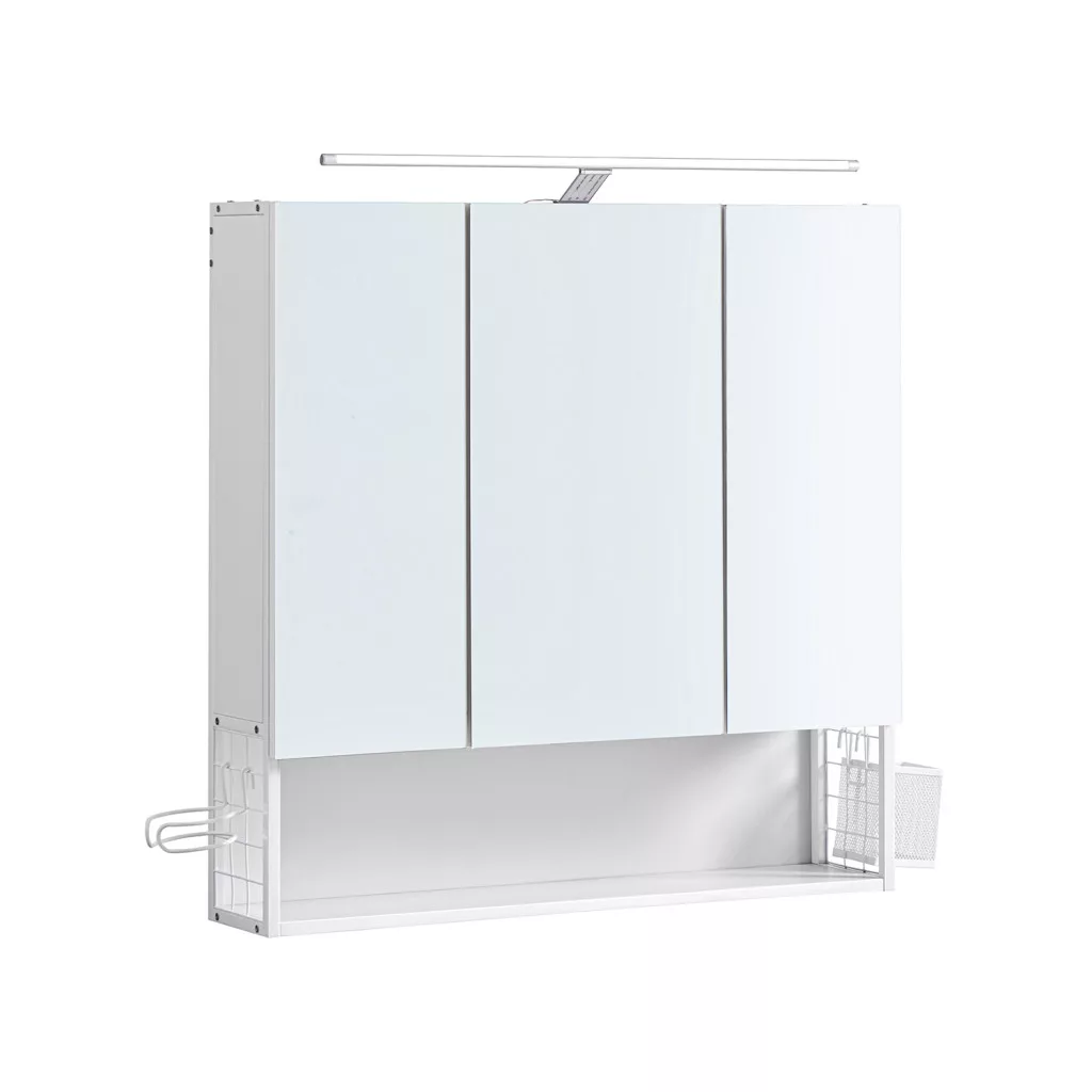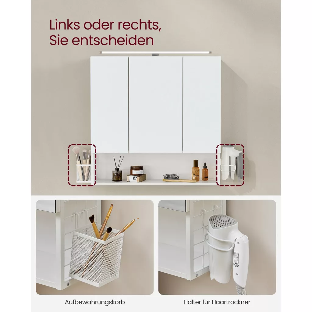Ez a modern VASAGLE fürdőszobai szekrény egyesíti a praktikus tárolást és az esztétikus megjelenést. A beépített LED világítás tökéletes megvilágítást biztosít a mindennapi szépségápolási rutinhoz, míg a három tükrös ajtó mögött bőséges tárolóhely található. Az állítható polcok lehetővé teszik a személyre szabott elrendezést.