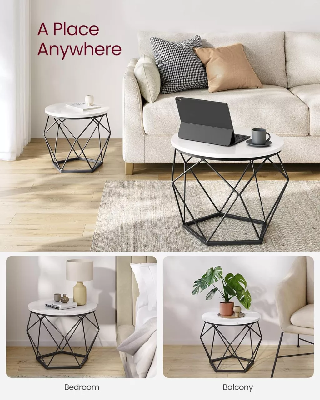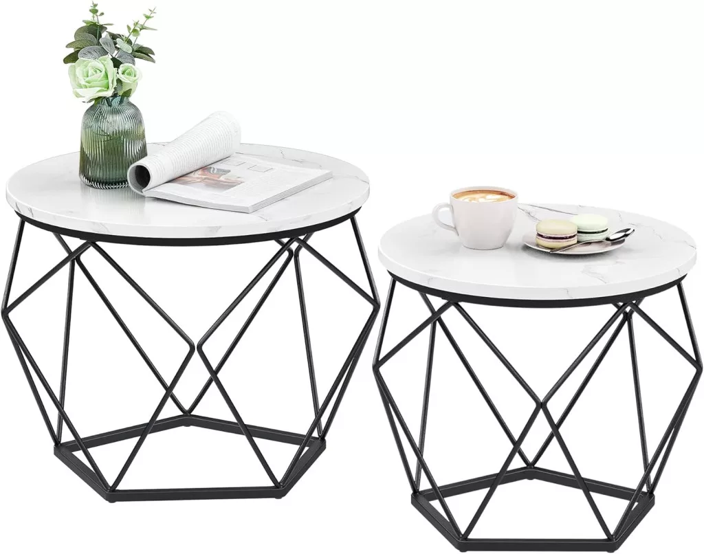Ez a VASAGLE dohányzóasztal szett ötvözi a modern dizájnt a praktikussággal. A geometrikus fekete acélváz és a letisztult fehér asztallap elegáns kontrasztot alkot, amely bármilyen lakberendezési stílusba könnyedén illeszkedik. A nagyobb asztal 50 cm-es, míg a kisebb 40 cm-es átmérővel rendelkezik, így rugalmasan használható akár együtt, akár külön-külön.