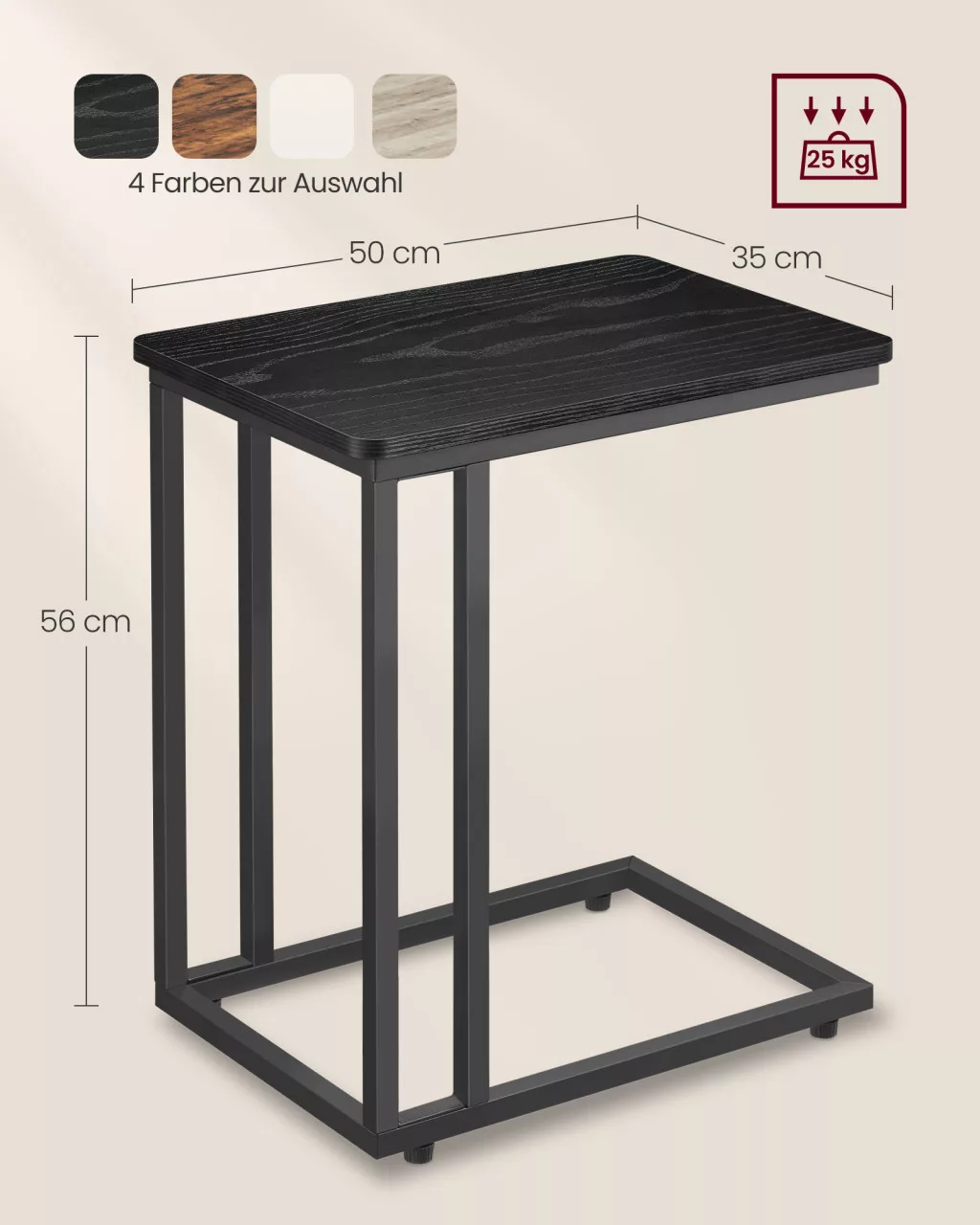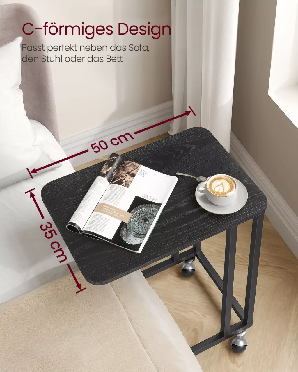 Sokoldalú C-alakú kisasztal görgőkkel vagy állítható lábakkal, tökéletes kiegészítő kanapé vagy ágy mellé. Elegáns fekete kivitelben, stabil acélvázzal.