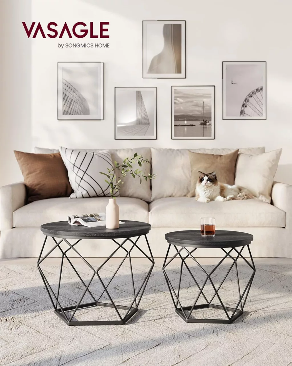 Ez a VASAGLE dohányzóasztal szett ötvözi a modern dizájnt a praktikussággal. A geometrikus acélváz és az antracit színű asztallap elegáns megjelenést kölcsönöz, míg a levehető felület tálcaként is használható. Az asztalok kompakt mérete ideális kis terekbe, mégis stabil szerkezetüknek köszönhetően 30 kg terhelést is elbírnak.