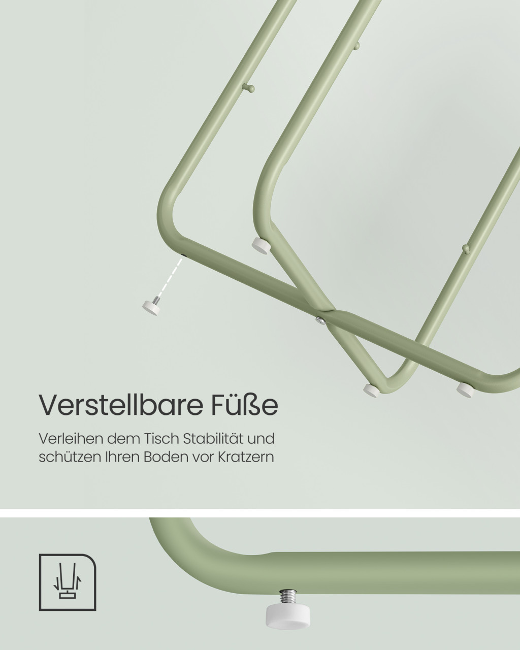 Ez a babérzöld és krémfehér színkombinációjú kisasztal tökéletesen ötvözi a modern dizájnt a praktikus tárolással. A stabil acélváz és a minőségi forgácslap asztallap tartós konstrukciót biztosít, míg az állítható lábak tökéletes stabilitást garantálnak minden padlófelületen.