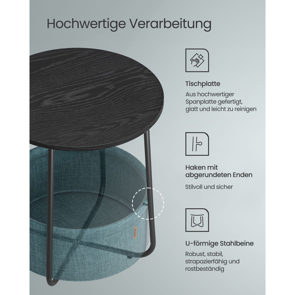 Ez a modern vonalvezetésű VASAGLE kisasztal egyesíti a praktikus tárolást és az elegáns megjelenést. A fekete fadekorációs asztallap és a türkiz textil tárolókosár harmonikus kontrasztot alkotnak, míg a U-alakú acél lábszerkezet stabil alapot biztosít.