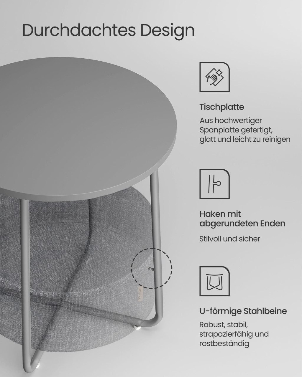 Ez a modern vonalvezetésű kerek kisasztal a tökéletes egyensúlyt teremti meg a stílus és funkcionalitás között. A galambszürke asztallap és a palaszürke textil tárolókosár harmonikus kombinációja bármely helyiség dekorációját kifinomultan egészíti ki. Az U-alakú acél lábszerkezet stabilitást és időtálló megjelenést biztosít.