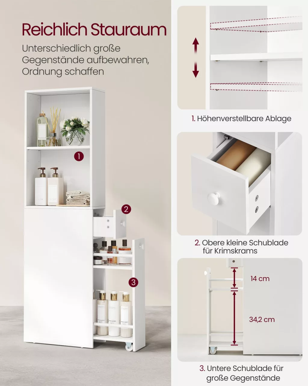 Kompakt és stílusos fürdőszobai tárolószekrény állítható polccal és fiókokkal, kifejezetten kis terekbe tervezve.