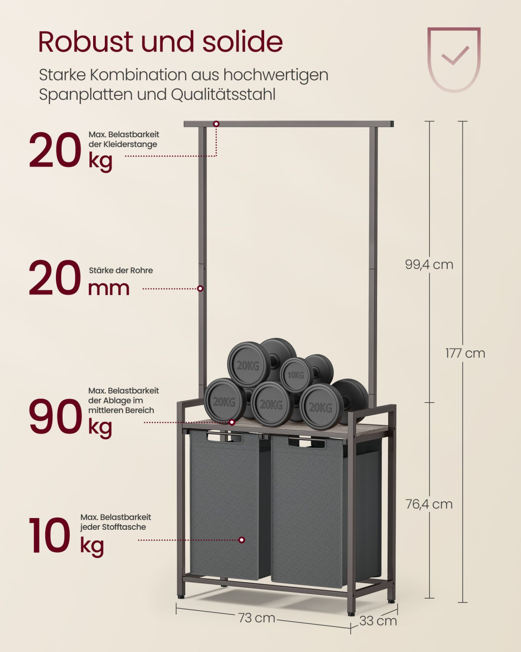 Ez a modern VASAGLE szennyestartó állvány tökéletes megoldást nyújt a mosodai teendők hatékony szervezéséhez. A két kivehető, összesen 92 literes tárolózsák lehetővé teszi a szennyes ruhák praktikus szétválogatását, míg a beépített ruhaszárító rúd és a felső polc extra tárolóhelyet biztosít.