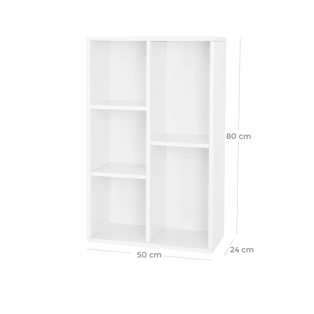 Kompakt és sokoldalú könyvespolc 5 tárolórekesszel, amely tökéletes megoldást nyújt könyvek, dekorációk és irodai kellékek rendszerezett tárolására.
