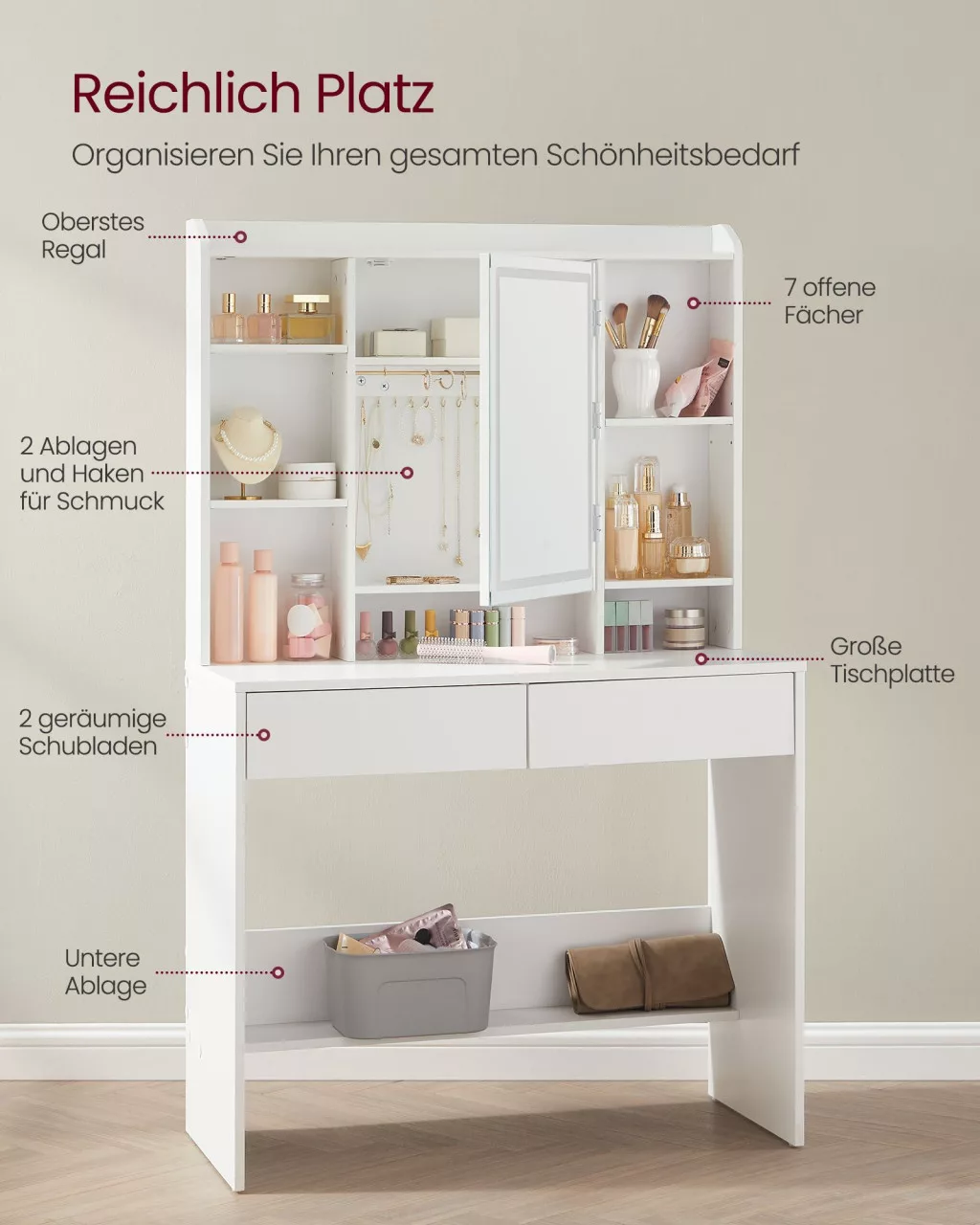 Az állítható magasságú polcok lehetővé teszik a különböző méretű kozmetikai termékek optimális elrendezését. A két fiók és az alsó polc további tárolóhelyet kínál, míg a tükör mögötti akasztók és rekeszek a kisebb kiegészítőknek adnak helyet.