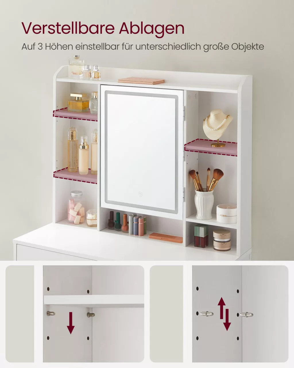 • Állítható magasságú polcok különböző méretű kozmetikumokhoz